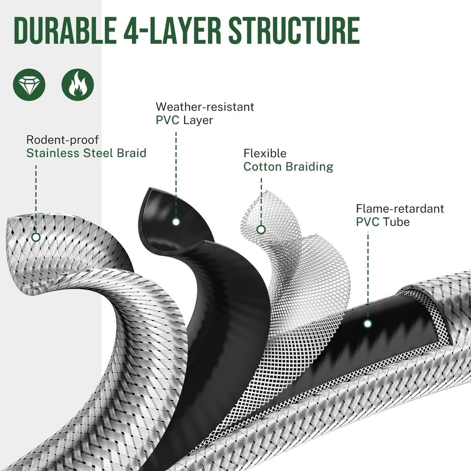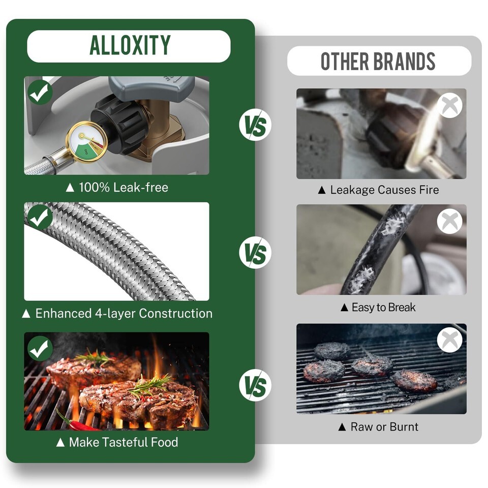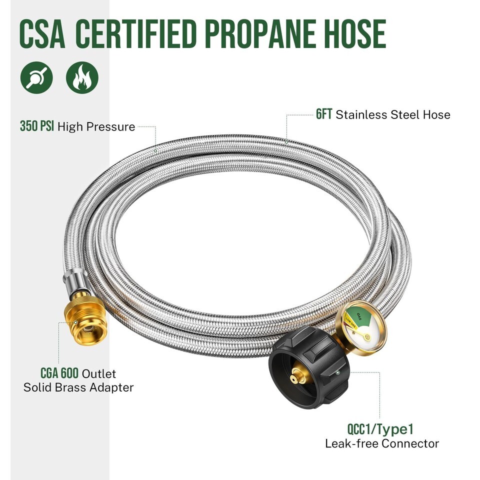 Leakage-proof Design ? Updated stainless steel braiding protects the propane tank hose from rodents? chewing. The propane hose consists of weather-resistant PVC, highly tensile cotton braiding, anti-corrosion PVC tube and stainless steel braiding. With a sturdy and flexible 4-layer structure, the propane adapter is strong enough to withstand harsh outdoor environments, ensuring durability.