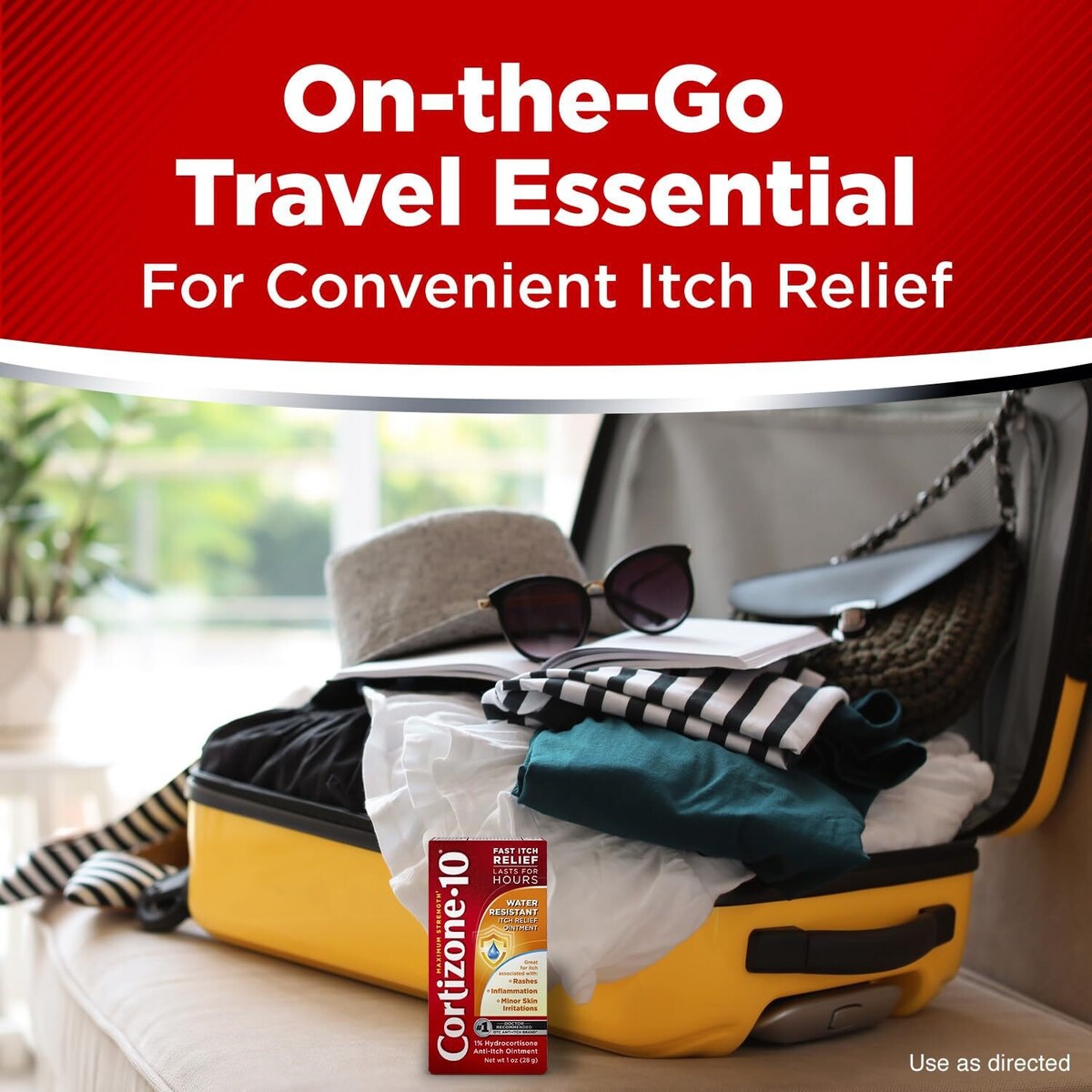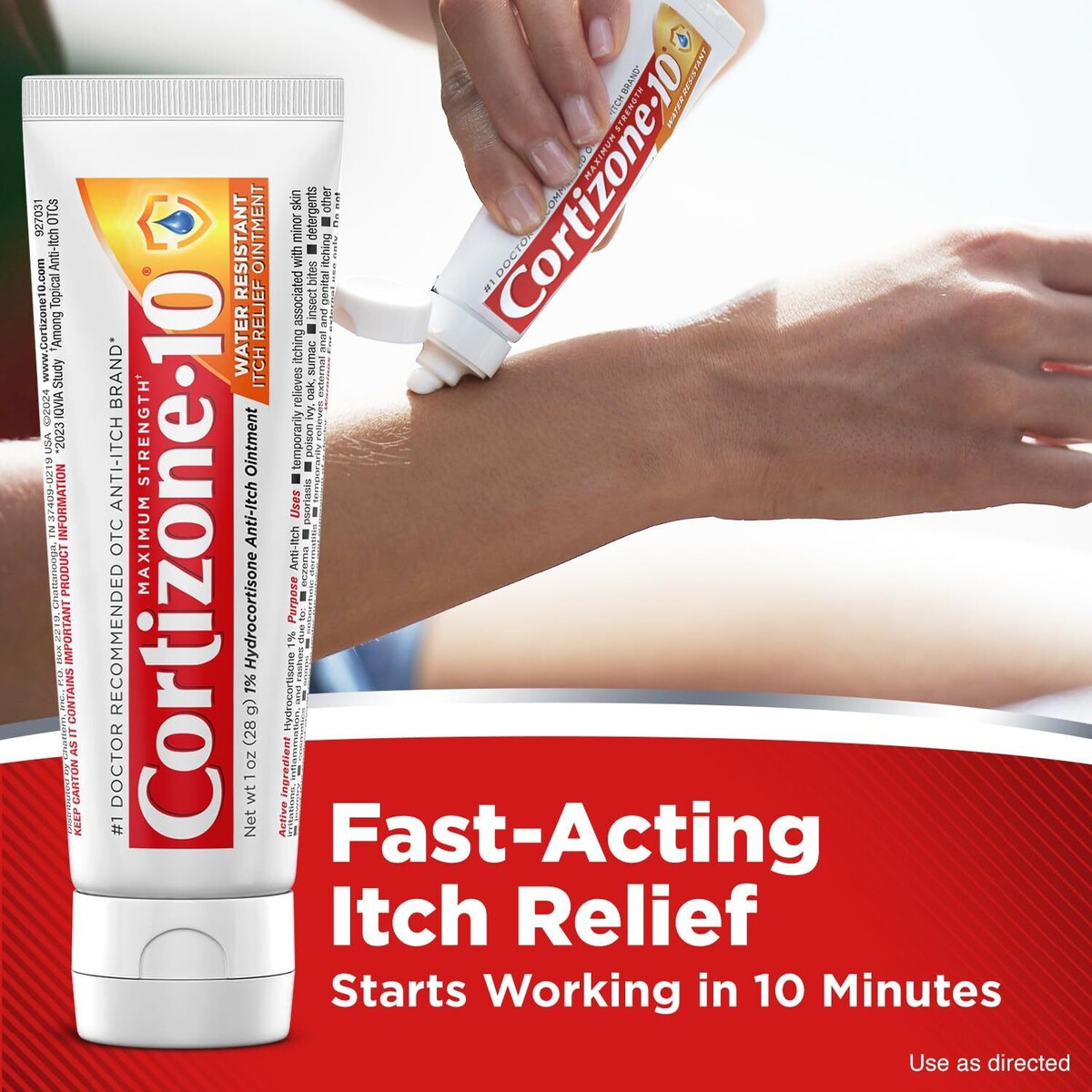? INCLUDES: One (1) 1 oz. tube of Cortizone-10 Maximum Strength* Water Resistant Itch Relief Ointment (*Among topical anti-itch OTCs) Box is distressed and open from rough handling Expiration Date of 8/2027 ? RELIEVES ITCH: Cortizone-10 helps relieve itch associated with minor skin irritations, inflammation, and rashes due to eczema, psoriasis, insect bites, seborrheic dermatitis, poison ivy, oak, sumac, and more ? WATER RESISTANT: Formula designed to stay on in water while locking in skin's moisture ? ACTIVE INGREDIENT: Formulated with 1% hydrocortisone for maximum-strength itch relief without a prescription ? TRAVEL ESSENTIALS: The perfect addition to first aid kits, camping essentials and travel bags for anytime you need on-the-go relief ? FAST ACTING: Relieves itch in 10 minutes with a fragrance-free and dye-free formula ? DOCTOR RECOMMENDED: Cortizone-10 is the No. 1 doctor-recommended OTC anti-itch brand* and is suitable for adults and children ages 2+ (*2024 IQVIA Study)
