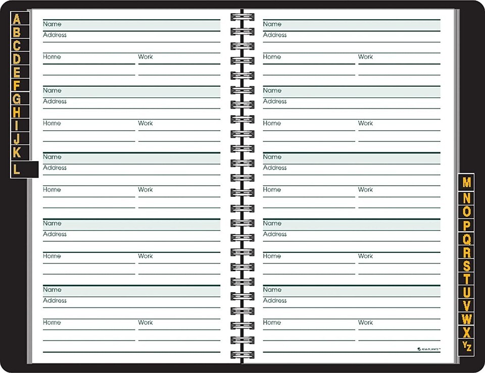 Details: The telephone/address book makes is easy to keep track of contact information for family, friends and colleagues. Room for 500 entries with single-letter tabs to quickly turn to any desired contact. Only the letters Y and Z are combined. Each entry contains ruled space for name, address, home phone, work phone, cell/pager, fax, email/web contact. Features large print, and the name line is shaded for easy identification of where each entry begins. Telephone/address book is wire bound with a flexible and textured black cover. Printed on quality paper containing 30% post-consumer waste recycled material using vegetable-based inks.