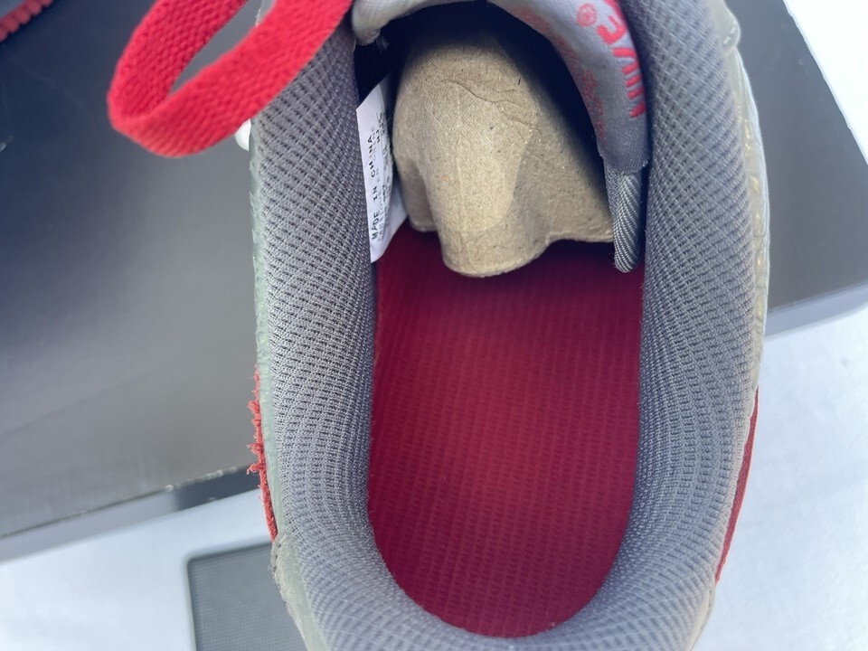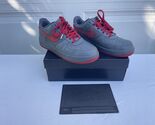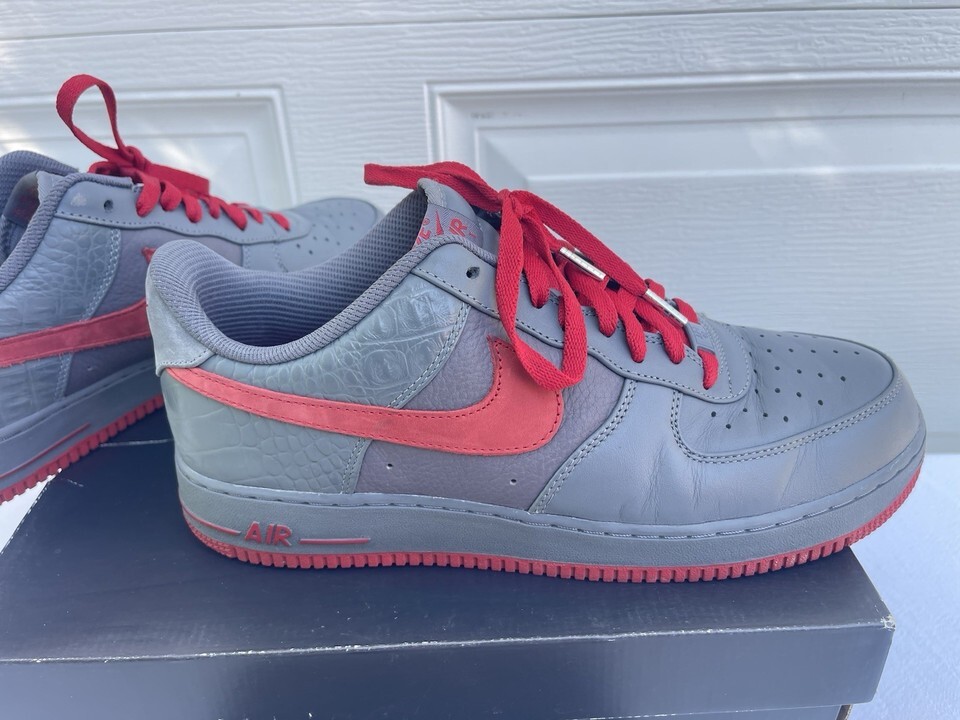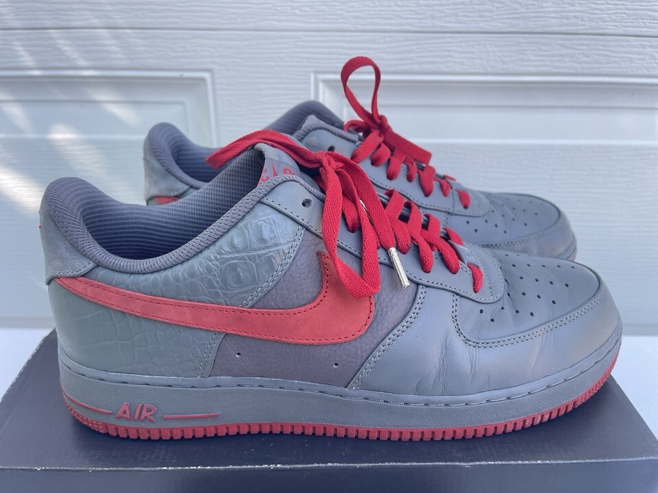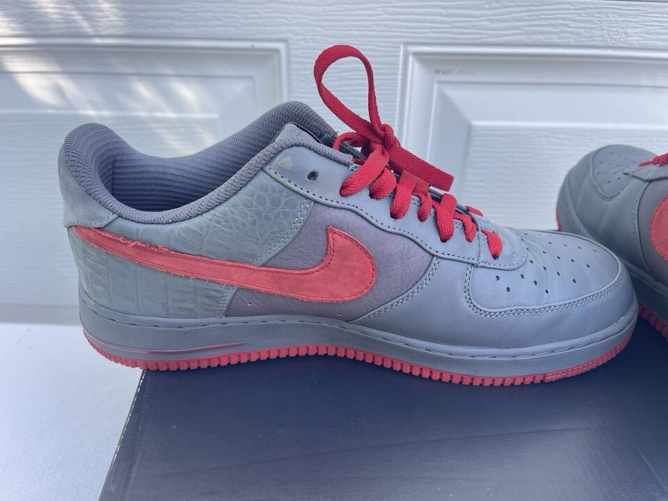 The product is a pair of Nike Air Force 1 Low Premium PRM sneakers in the color Flint/Varsity Red, featuring a low top style with a lace-up closure. These size 11.5 shoes are designed for athletic activities, such as boxing, with a rubber outsole for optimal performance. The leather upper material and standard shoe width provide a comfortable fit for casual or activewear occasions during the summer, fall, or spring seasons. Made in Vietnam, these sneakers are a stylish and versatile addition to any man's footwear collection.