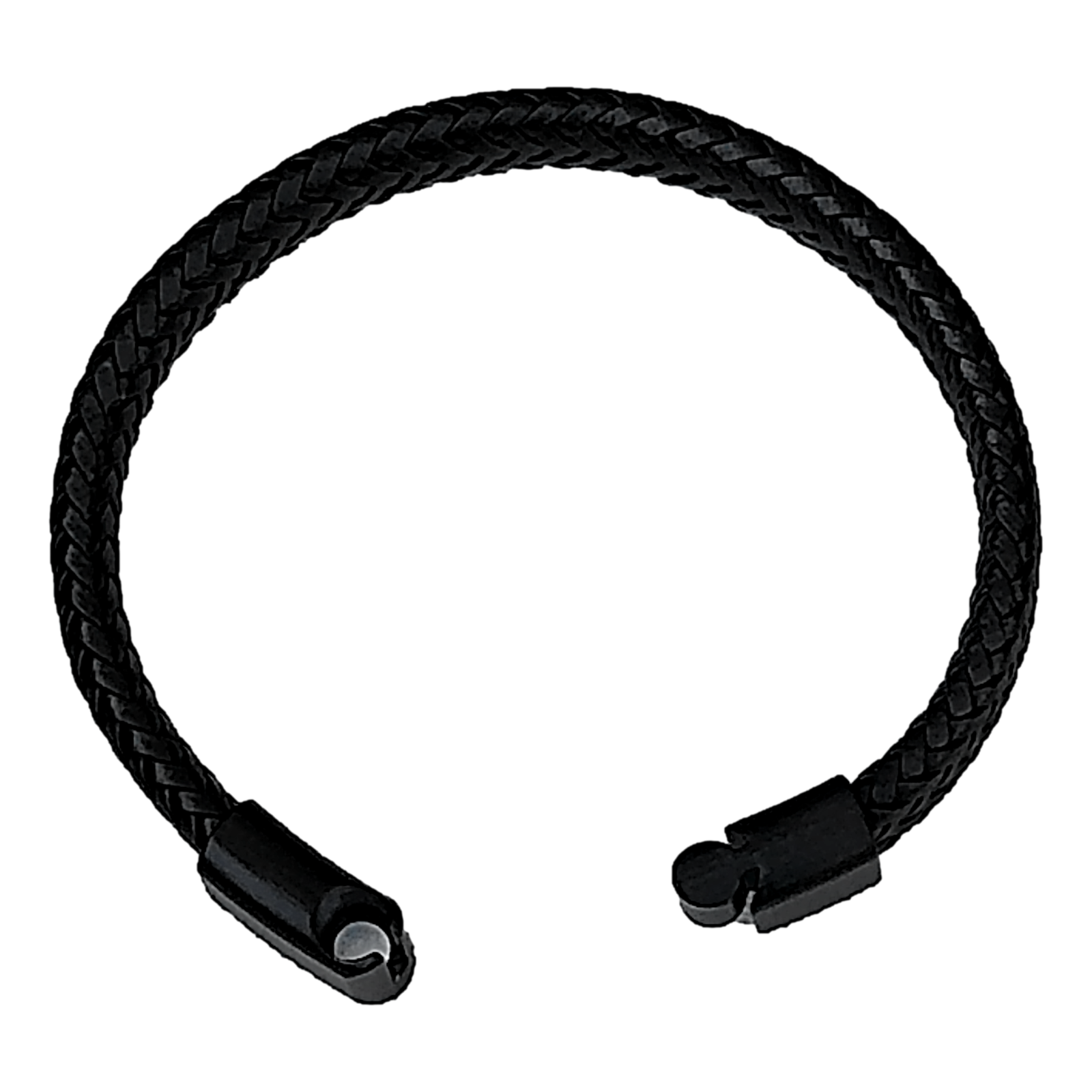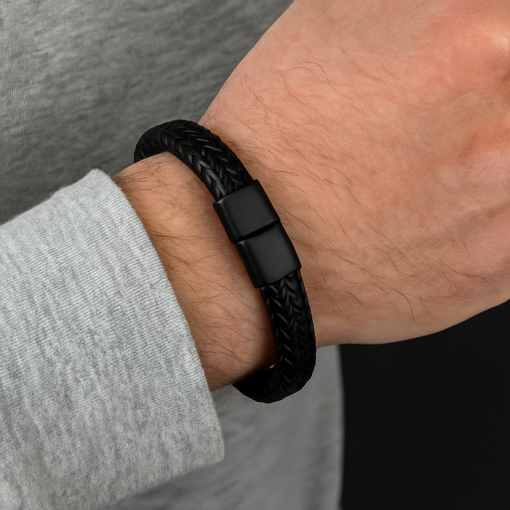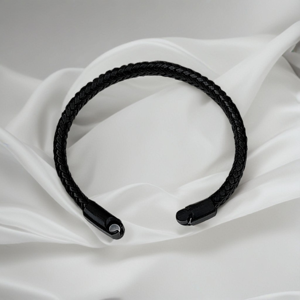 This USA DEALS NOW bracelet features a braided vegan leather strap in classic black ? lightweight, durable, and built for everyday wear. Whether you're going for a modern minimalist look or a laid-back boho vibe, this piece adapts to your style.