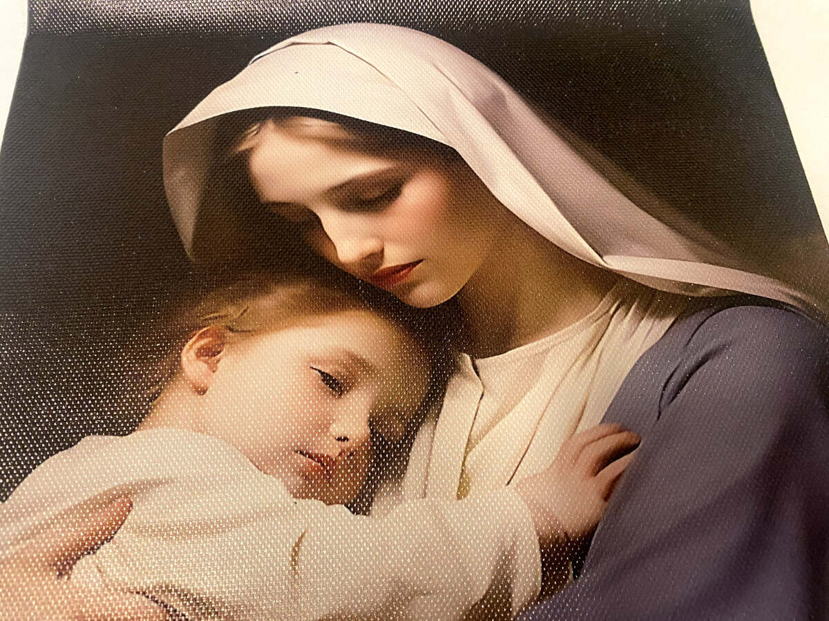 Your purchase is for a beautiful image of Our Blessed Mother Mary with Child. This image comes set on a unframed canvas.