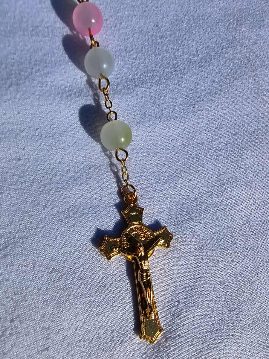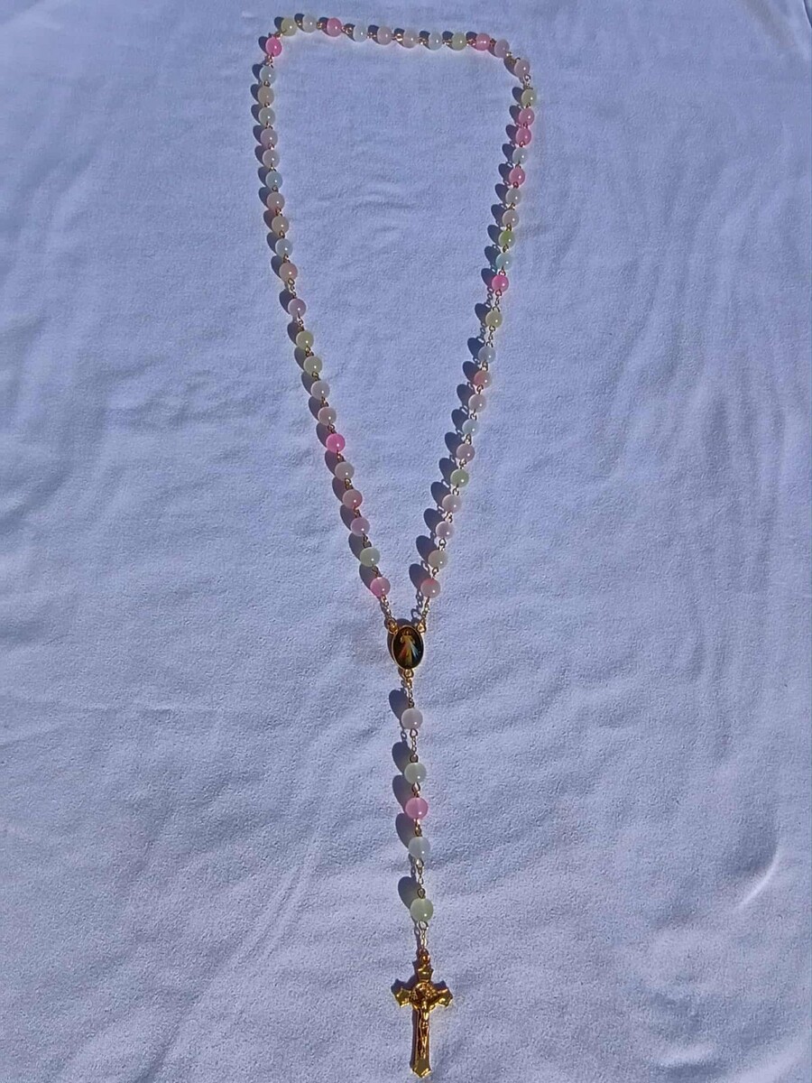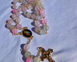 This delicate rosary features 8mm frosted pastel glass beads in soft shades of pink, white, and blush. Each bead is hand-linked with gold-tone wire, creating a warm, feminine, and serene design. The rosary is finished with a gold-tone crucifix and a vivid Divine Mercy centerpiece, making it a lovely devotional piece and a heartfelt gift.