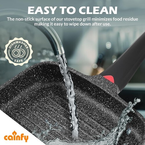 Cainfy 11 Inch Non Stick Grill Pan - Black (Open Box) PRODUCT DESCRIPTION Cainfy believes the quality of a home life is visible from the kitchen. In our life, only love and food can not live up to. Imagine coming home, turning on relaxing music, slowly chopping vegetables, and hearing the food in the pot dancing,and watching your lover take the food from the brightly colored plate and taste it. What a lucky thing it is. From the beginning of the establishment of the brand, Cainfy has been adhering to the consistent rigorous and aggressive attitude, constantly committed to the production of high-quality kitchen supplies. From the unique core technology, to the humanized design and the constantly upgraded craftsmanship quality, the constantly changing Cainfy continuously uses the quality cooking experience to inspire your quality life. FEATURES: * Versatile Cooking: Discover the ultimate flexibility with our grill pans, ideal for transforming any stovetop into a grilling paradise. This frying pan features a durable granite non-stick coating that is PFOA, lead, and cadmium free for superior release and easy cleanup. * Superior Heat Distribution: Our stovetop grill ensures even heat distribution, allowing for perfectly seared steaks and deliciously grilled vegetables. Whether you're using a gas or electric stove, this grill for stove top delivers consistent results with every use. * Durable Construction: Crafted with premium materials, our steak pan is designed to withstand high temperatures and everyday use. The robust build of these grill pans ensures long-lasting performance, allowing you to enjoy grilled dishes from the comfort of your home. * Easy to Clean: Cleaning up after grilling is a breeze with our grill pans. The non-stick surface of our stovetop grill minimizes food residue, making it easy to wipe down after use. Enjoy hassle-free grilling and spend more time savoring your meals rather than scrubbing dishes. * Elegant Design: Enhance your kitchen with the sleek, modern design of our grill pans. The stylish appearance of this steak pan not only complements any kitchen decor but also adds a touch of sophistication to your cooking experience. Elevate your stovetop grilling with functional elegance. Condition: Open Box Color: Black Copyright All rights reserved.