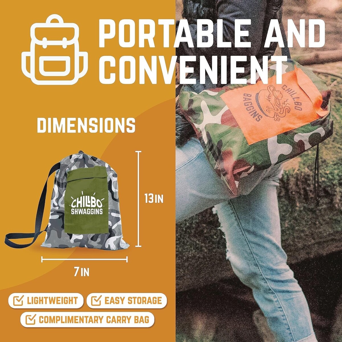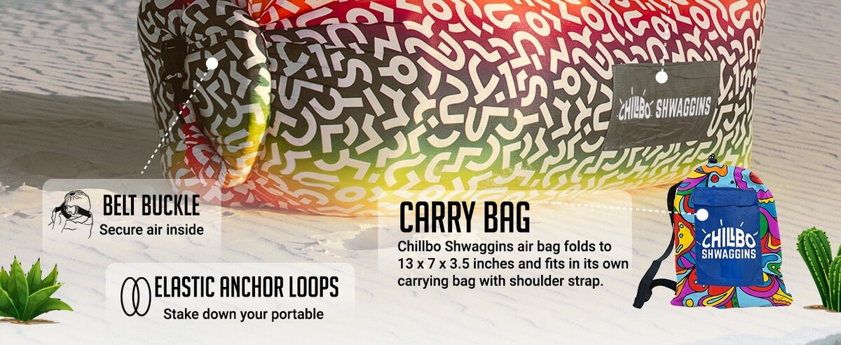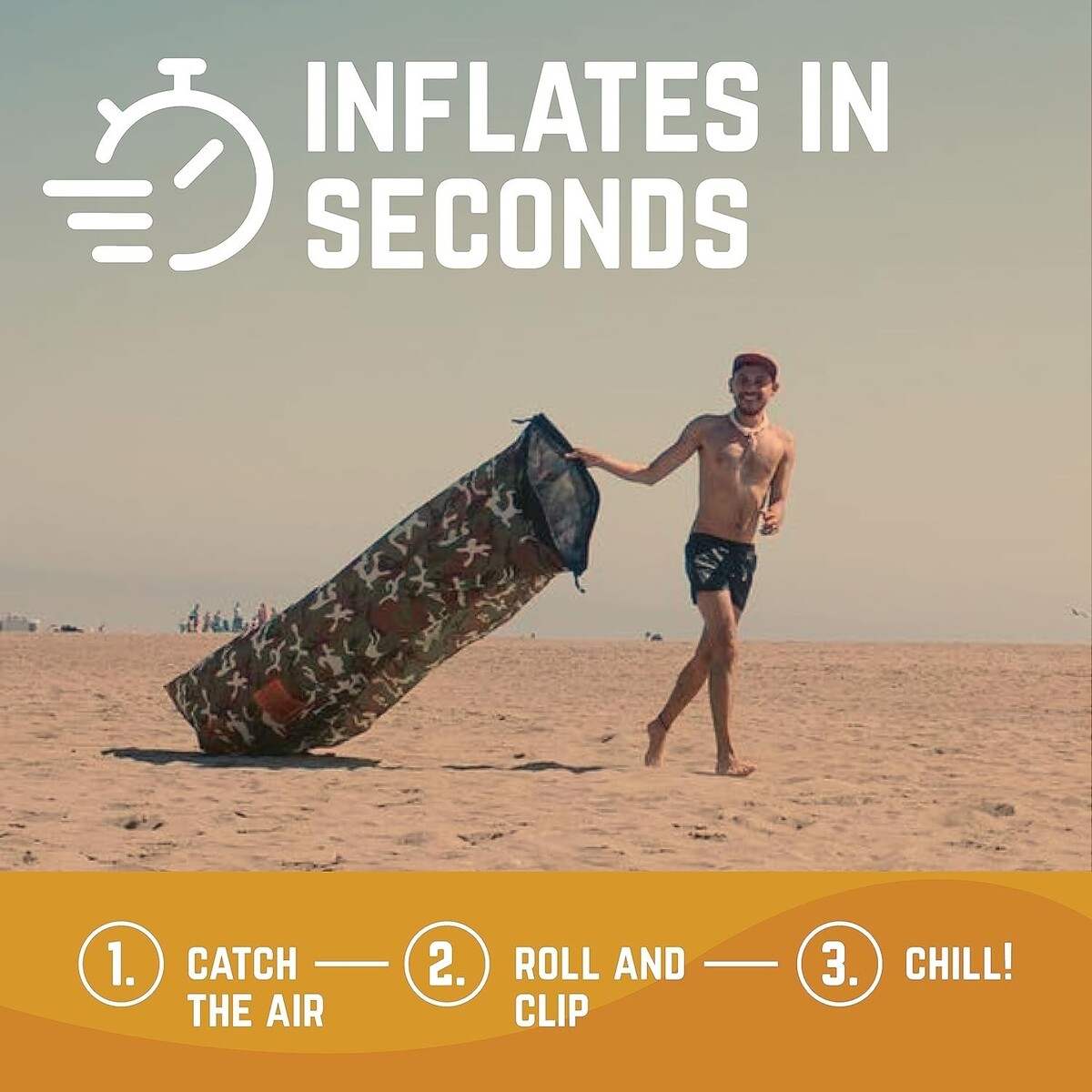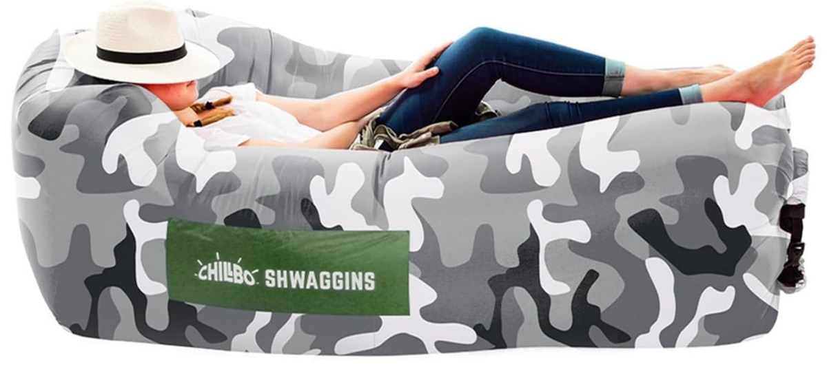Chillbo Shwaggins Inflatable Couch, No-Pump Setup Grey Camo Ripstop Polyester NEW No-Pump Setup ? Relax in Seconds - Inflate the Chillbo inflatable couch in just a few swoops of air?no pump needed. Ideal for spontaneous beach days, tailgates, festivals, or camping. Built for Stability in Wind - Enjoy the outdoors without worry?anchor loops and the included wind stake keep your lounger anchored even on breezy days at the beach, park, or campsite. Ultimate Comfort Versatility - Lounge solo or share with friends?this air lounger comfortably supports 400?450 lbs. Side pockets keep your phone, book, and snacks within easy reach. Durable Weather-Ready Design - Made from ripstop polyester, this durable inflatable couch resists wear and tear from rough surfaces and long outdoor use. Comes with repair stickers for peace of mind. Portable Travel-Friendly - Packs easily down into a small, convenient, and lightweight carry bag approximately 13"7" and weighing under 3 lbs. You can carry it directly over your shoulder or even fit it easily in a backpack, making it the perfect choice for your next trip or outdoor adventure. FAST SHIPPING!!! Buy with confidence. Check out our reviews.