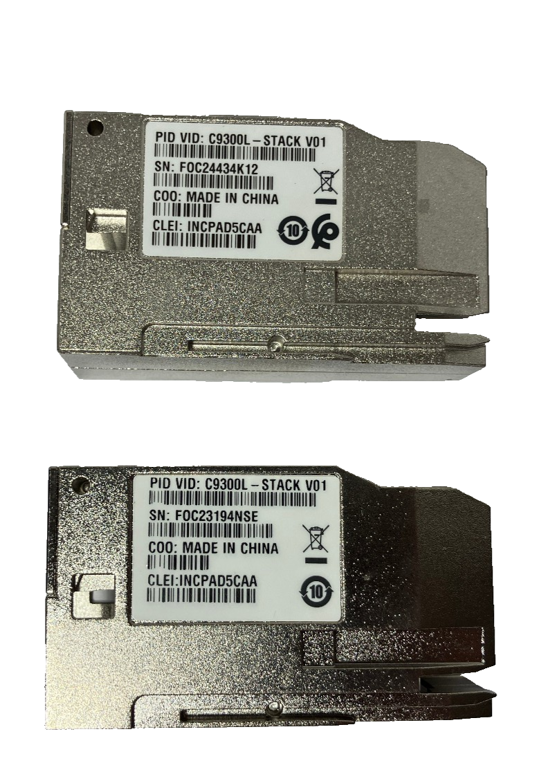 This is for a new open box Cisco C9300L-STACK-KIT Stack Kit for C9300L - 2 V.01 Adapters and 1 Stack Cable. USA Seller! Condition: New Open Box. Includes 2 Adapters and 1 Stack Cable as shown. See Photos. NOTE: You will receive exactly what is shown in the photos only, and nothing additional. Ships from Austin, Texas !!! We are a Mom and Pop local business!!! All the money is spent back in the local and US economy!!! Thank you for the business!!! FAST SHIPPING!!! Product Description: The Cisco Catalyst 9300L Stack Kit (C9300L-STACK-KIT) is a high-speed network stacking module designed to expand Cisco Catalyst 9300L and 9300LM switch deployments. Built on Cisco?s trusted StackWise-320 architecture, this kit enables seamless stacking of switches for superior scalability, simplified management, and robust enterprise redundancy. Ideal for business networks, campus edge configurations, and branch network expansion, this Gigabit stack kit offers up to 320 Gbps stacking throughput, allowing up to 8 compatible switches to function as a single logical unit. Cisco Stack Kit Features Benefits High-Speed Stack Cable: 0.5-meter StackWise cable supports 320 Gbps total stacking bandwidth Modular Stacking Architecture: StackWise-320 supports flexible enterprise scaling Unified Switch Control: Manage up to 8 stacked switches as one logical unit Compatibility: Designed exclusively for Cisco Catalyst 9300L and 9300LM switches Redundancy Support: Enhanced failover and load balancing in stacked network design Easy Plug-and-Play Deployment: Tool-free integration with existing Cisco environments Rack-Optimized: Minimal space impact with backplane-mounted design Ideal for: High-availability enterprise stacks, IT backbone upgrades, and switch failover protection Cisco C9300L Specs ? Technical Specifications Manufacturer: Cisco Model: C9300L-STACK-KIT Included Components: 2x Stack Adapters, 1x 0.5m High-Speed Stacking Cable Stacking Bandwidth: 320 Gbps Compatibility: Cisco Catalyst 9300L 9300LM Series switches only Max Stack Size: Up to 8 units Stacking Interface: Proprietary back-panel StackWise-320 Connection Type: Network Stack Interconnect Operating Temperature: Matches host switch spec Works natively with Cisco Catalyst IOS XE software. Plug-and-play stacking module with tool-free installation. Can be installed without tools. What?s included: 2x Cisco Catalyst Stack Adapters 1x 0.5 Meter High-Speed Stack Cable STACK-T3-50CM