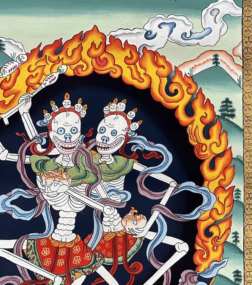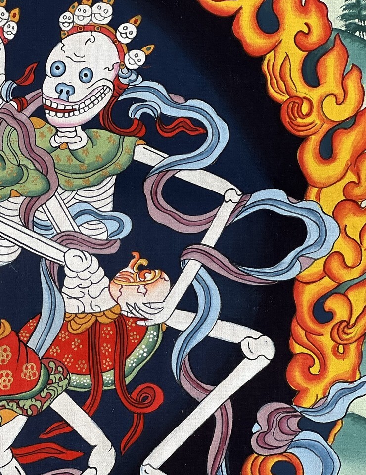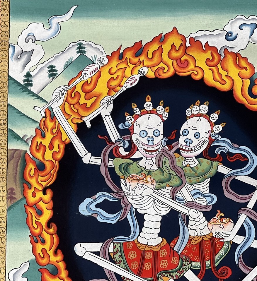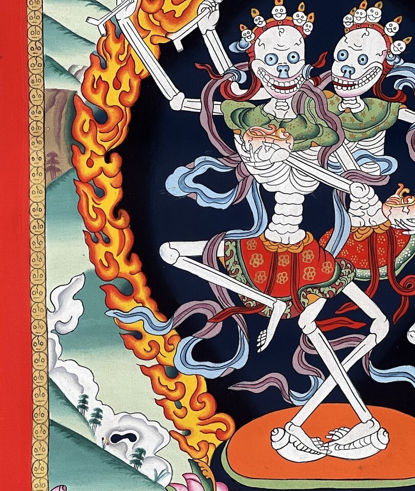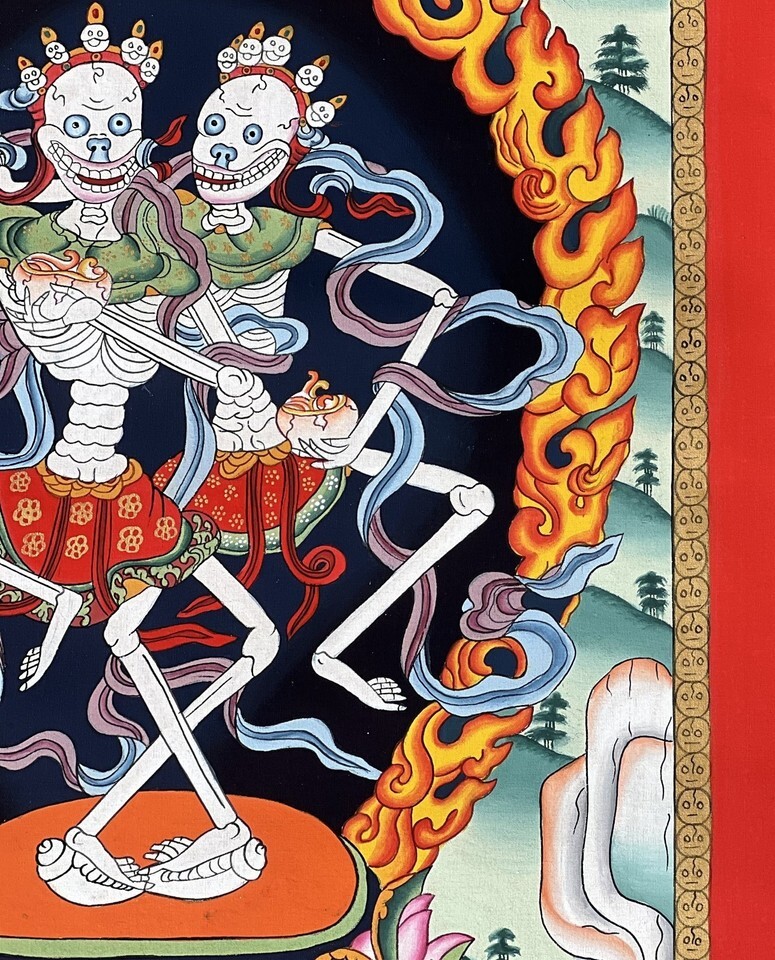 This is an original hand-painted Newari Paubha Thangka depicting the Citipati, the skeletal guardian deities shown in powerful yab-yum (sacred union). Painted on handmade cotton canvas with natural mineral pigments , this rare Thangka captures the fierce yet protective energy of Tantric Buddhist art.