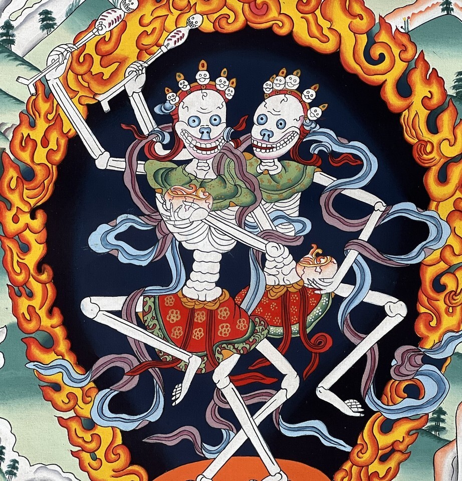- CITIPATI SKELETON DEITY YAB YUM ORIGINAL HAND-PAINTED NEWARI TIBETAN THANGKA