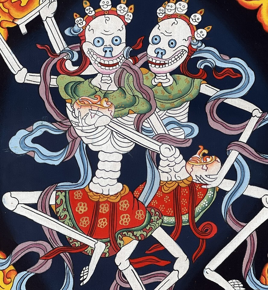 The Citipati, known as the Lords of the Cremation Ground, symbolize life, death, and rebirth. Their skeletal form reminds us of impermanence and the truth that all beings face mortality. Despite their fearsome appearance, they are protectors who ward off evil forces and obstacles on the spiritual path.