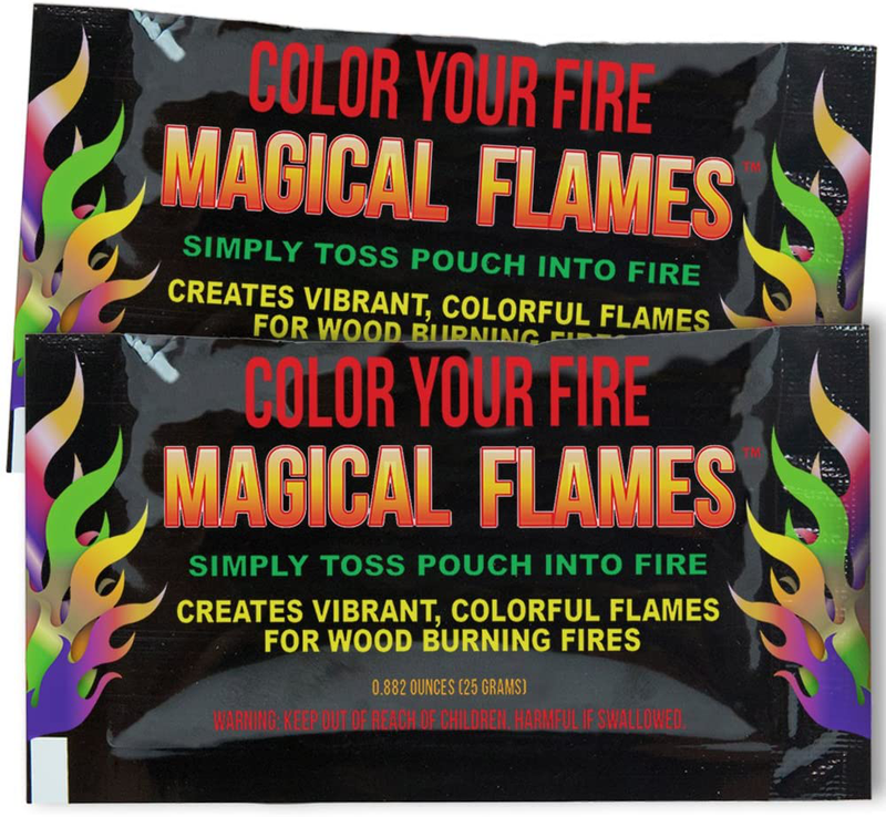 Want to add a little magic to your fire? Magical Flames are the perfect accessories for any wood burning fire! Simply toss an UNOPENED packet or two into your fire for a magical experience that is sure to delight all ages! It?s the best campfire novelty product on the market today and you?ll be amazed by the vibrant colors produced. Magical Flames adds dazzling blues, brilliant greens, and delightful purples to transform a boring yellow and orange fire to a dancing rainbow of flames!