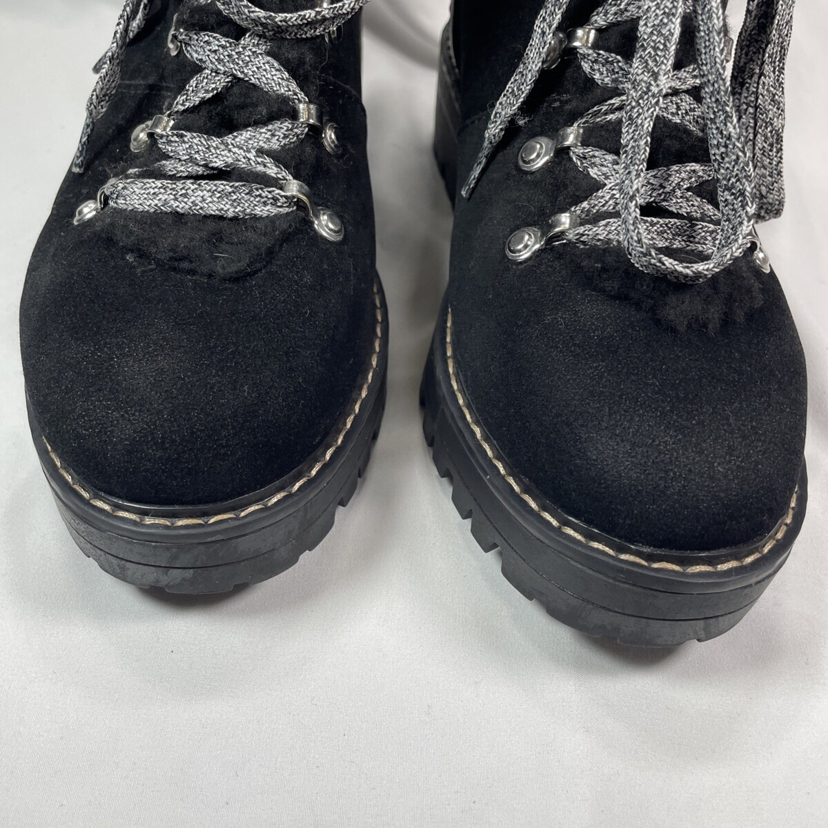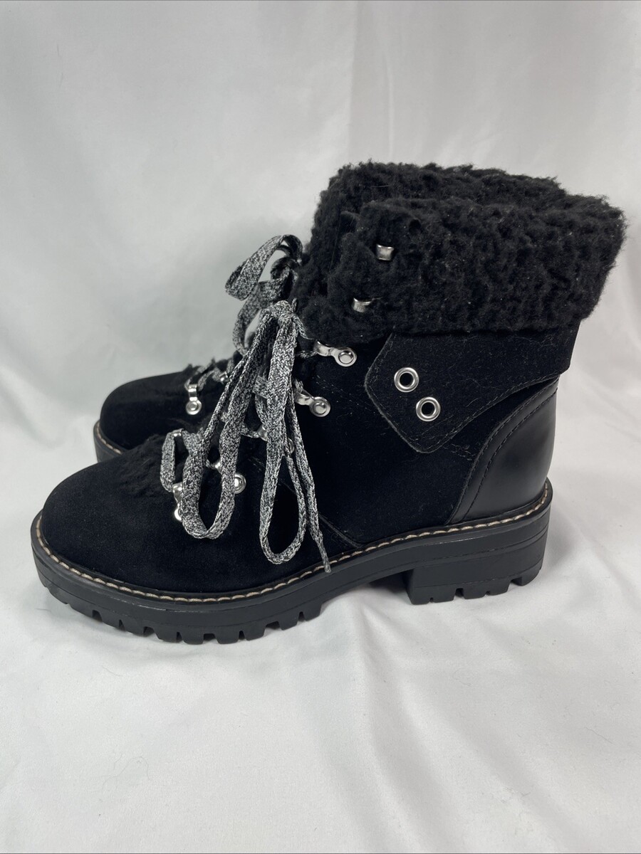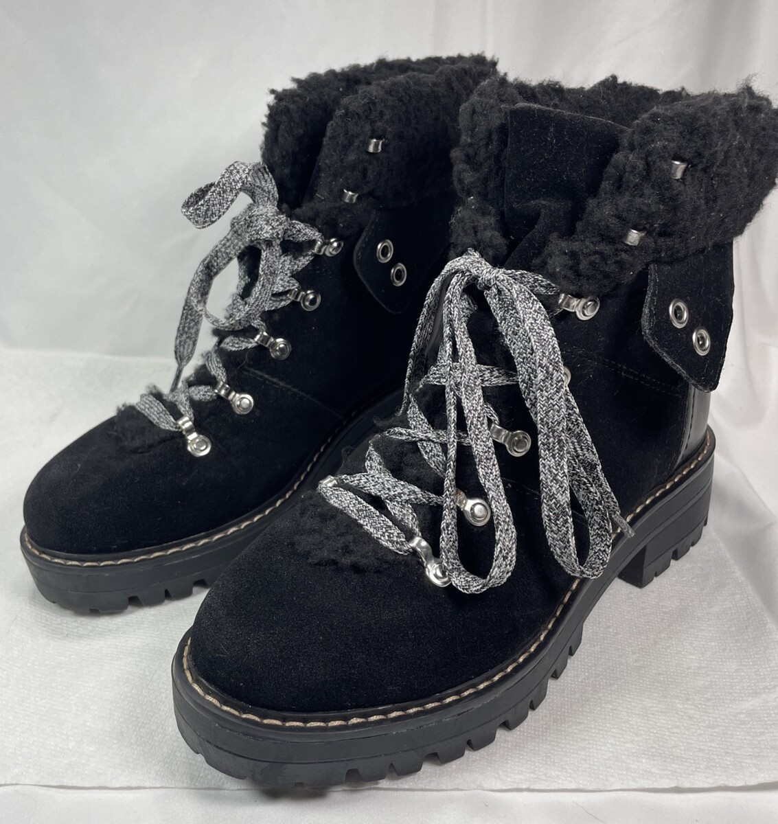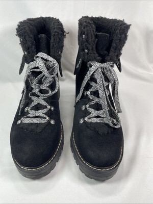 Elevate your shoe collection with these stylish Time Tru Combat Ankle Boots. The boots feature a solid black color with a faux suede upper material and a closed toe design. The low block heel adds a touch of sophistication to the overall look, while the lace-up closure provides a comfortable fit. These boots are perfect for any occasion, whether it's for a casual day out or a night on the town. The wide calf width and rubber outsole material ensure a comfortable fit and excellent traction. The insole material is also made of fabric, which adds to the overall comfort of the boots. Don't miss out on the chance to add these versatile boots to your wardrobe. Pre-owned, very clean and excellent condition. Slight color difference on front left toe area. See pictures.