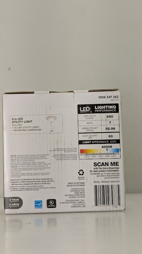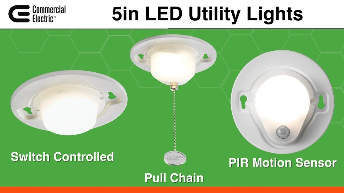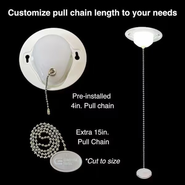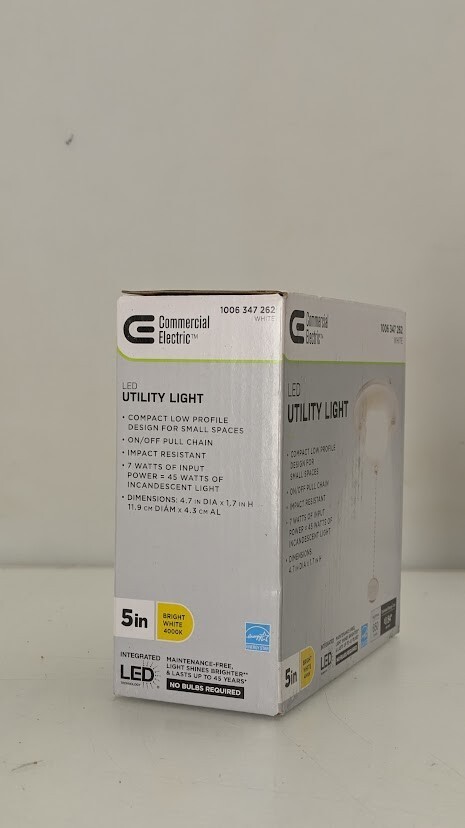 Item Condition Opened box - original retail box is dented. In excellent condition. Opened but never been used. We have tested this for power. Item Location Ships from our warehouse in Las Vegas, Nevada, 89102, USA Fast Shipping We handle all paid orders within 1 business day. Best Offers Accepted Offers are reviewed at the close of business each night. We accept reasonable offers for - Multiple units of the same item - Errors or condition changes within our listing - Combining shipping for 2 or more separate orders Return Policy We offer a 30 day return window from when you receive the item. Items must be in the same condition and in original packaging. Seller Warranty - We Protect Against Defects Our in-house technicians evaluate and refurbish every electronic item we list. We are proud to offer our customers a 30-day warranty against defects. Contact us directly by selecting "I have a question about using my item or I want to send the seller a message." We are eager to hear from our customers. Product Description The Commercial Electric 5-inch Universal Round Utility Closet Light offers versatile accent, task, or general lighting with a low-profile design, making it ideal for tight spaces. This is a direct wire light to be controlled by your wall switch and provides consistent, clear illumination without yellowing or dark spots, ensuring a maintenance-free and efficient lighting solution. Great for closets, pantry, utility room, stairwell, attic, garage, basement, laundry room, storage room and more. Compact, great for small spaces ON/OFF Pre-installed 4in. Pull Chain with Extra 15in. Pull Chain 7-Watts of input power is equal to 45-Watt incandescent bulb 650 Lumens of brightness 4000K Bright White color temperature of light output Non Dimmable Suitable for damp locations 120-Volt Product Dimensions: 4.7in. Dia. x 1.76in. H - Weight: 0.23 lbs. Maintenance free with no bulbs to replace Rated life up to 50,000 hours