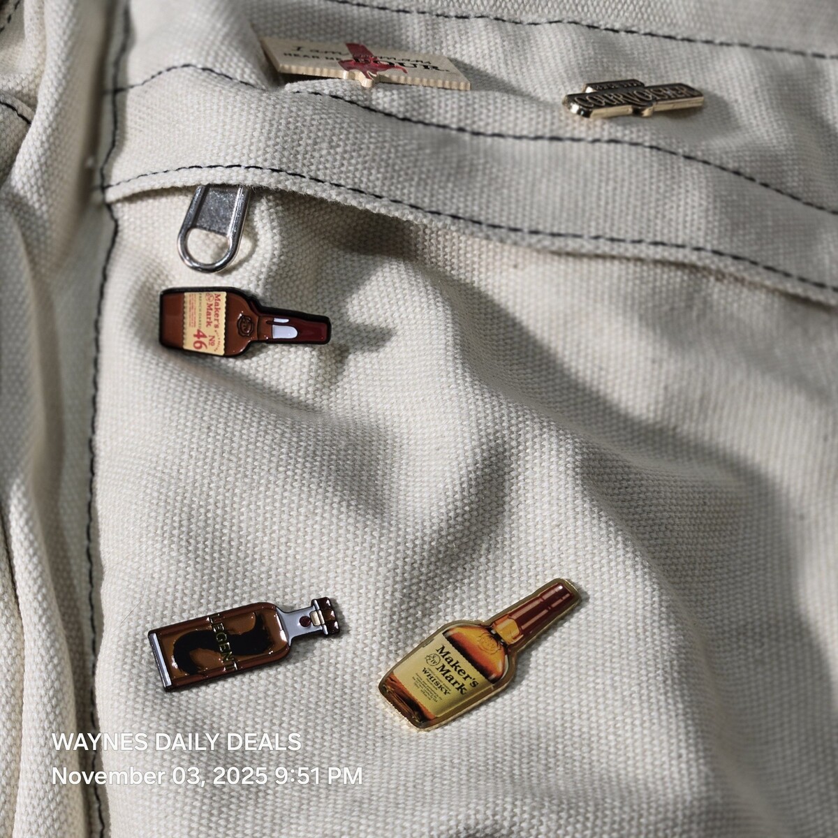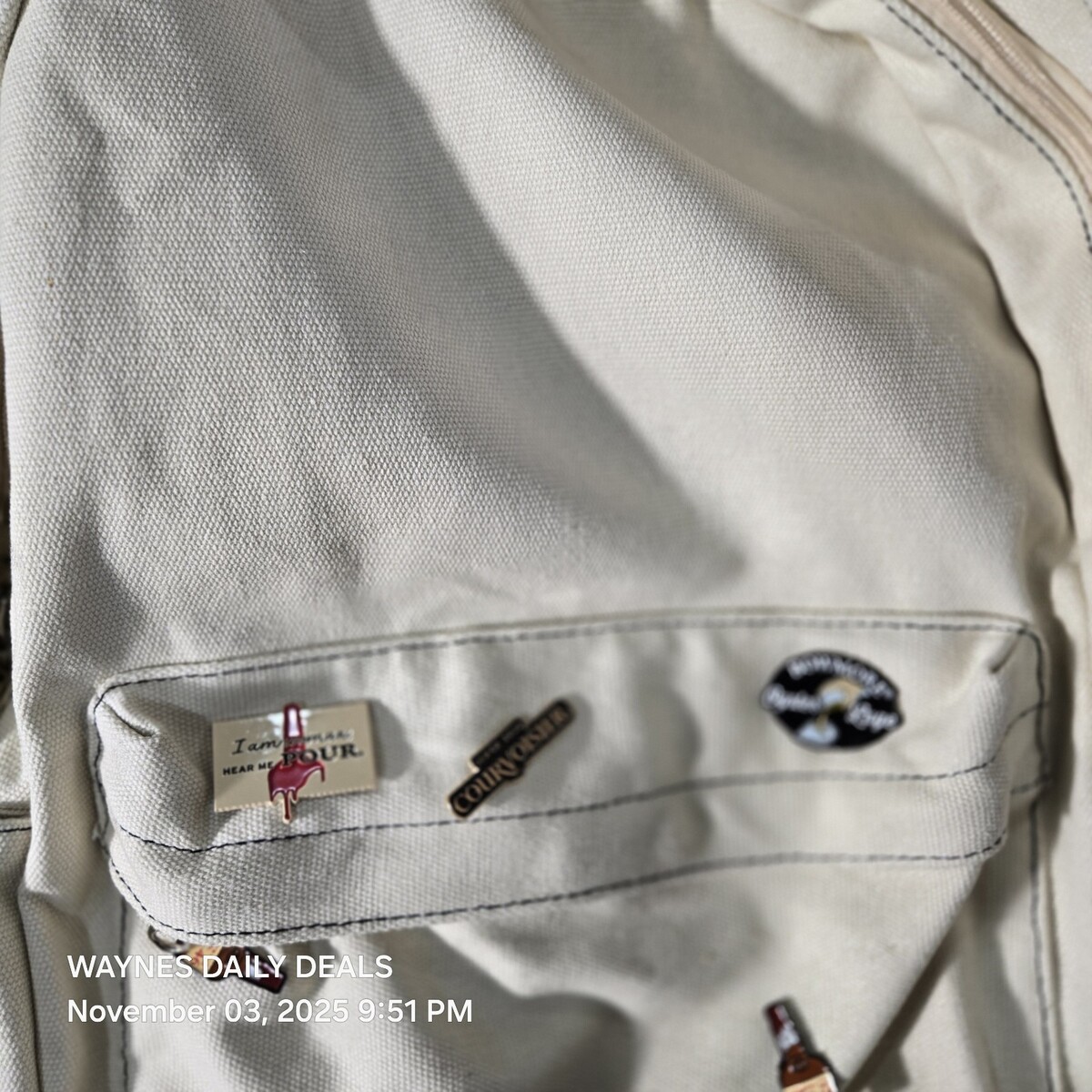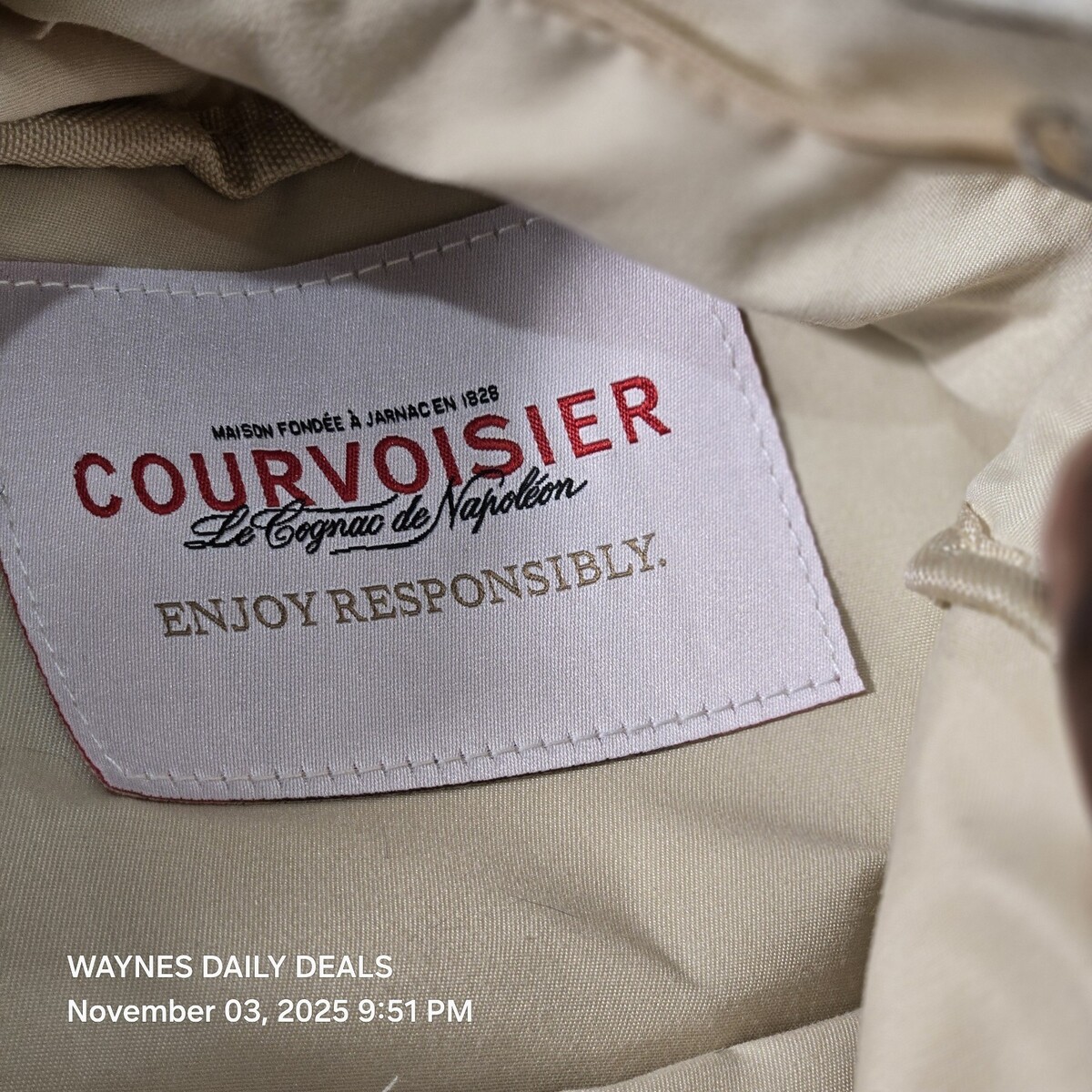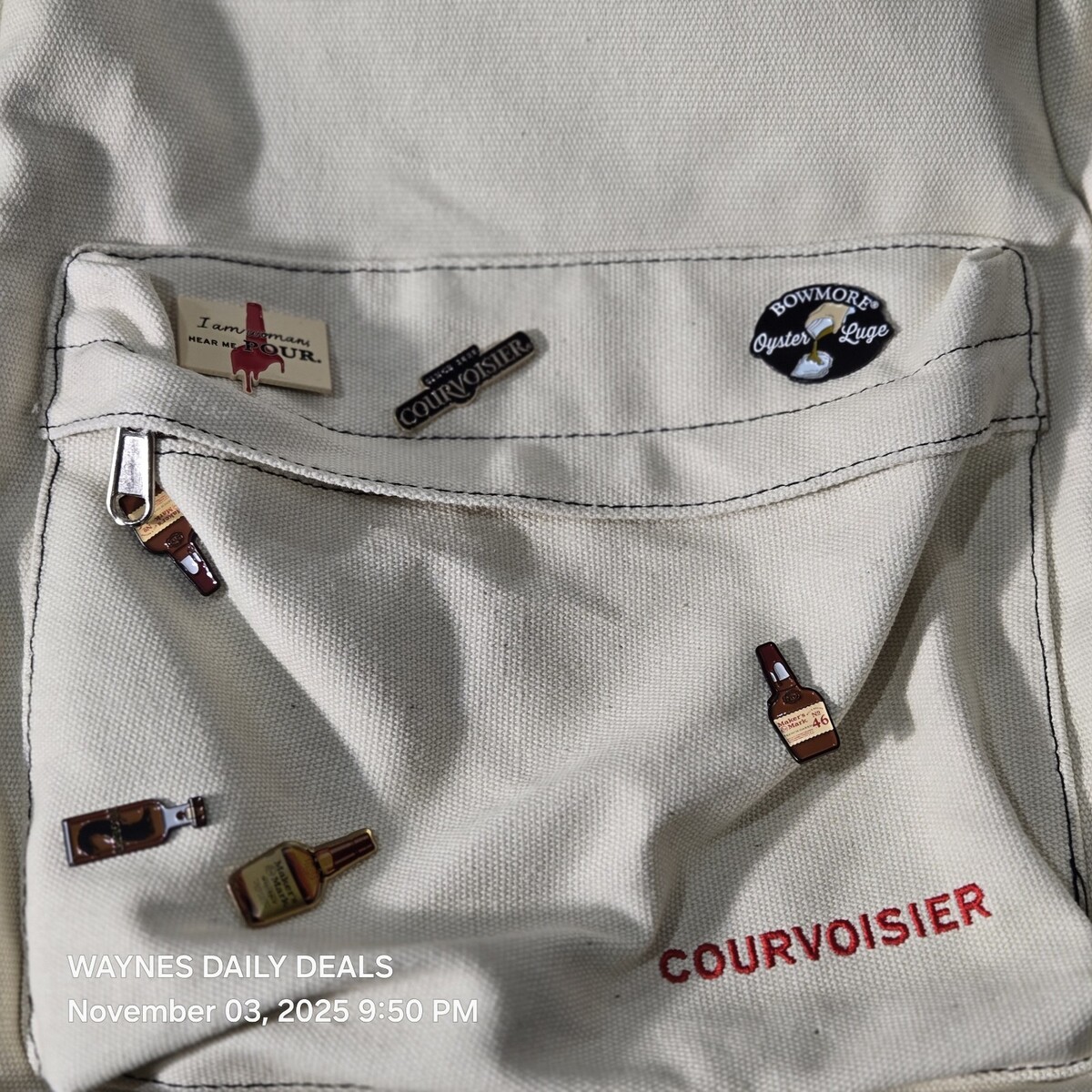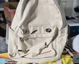 Stylish off-white Courvoisier backpack made from durable canvas material. Features embroidered Courvoisier logo, front zip pocket, adjustable straps, and five collectible liquor-themed enamel pins attached to the front. Includes interior label reading ?Courvoisier ? Le Cognac de Napoleon ? Enjoy Responsibly.? Excellent promotional or collector?s item for cognac and spirits fans bag has few dirt marks check pics