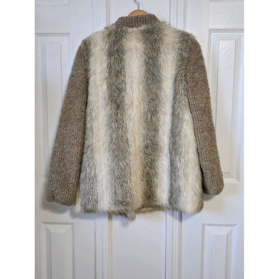 Wrap yourself in luxurious warmth with this stunning D'Esprit coat, a unique creation by Dubrowsky and Perlbiner. The striking combination of plush faux fur in a naturalistic stripe pattern with cozy knit sleeves creates a captivating silhouette. Charming wooden toggle closures add a rustic, artisanal touch, making this piece a true statement maker. The silky lining glides effortlessly, promising comfort with every wear. Perfect for a sophisticated evening out or a chic daytime ensemble.