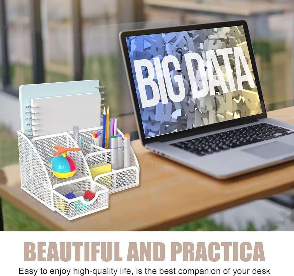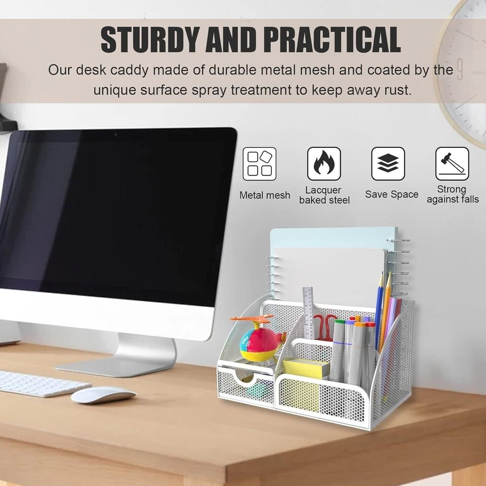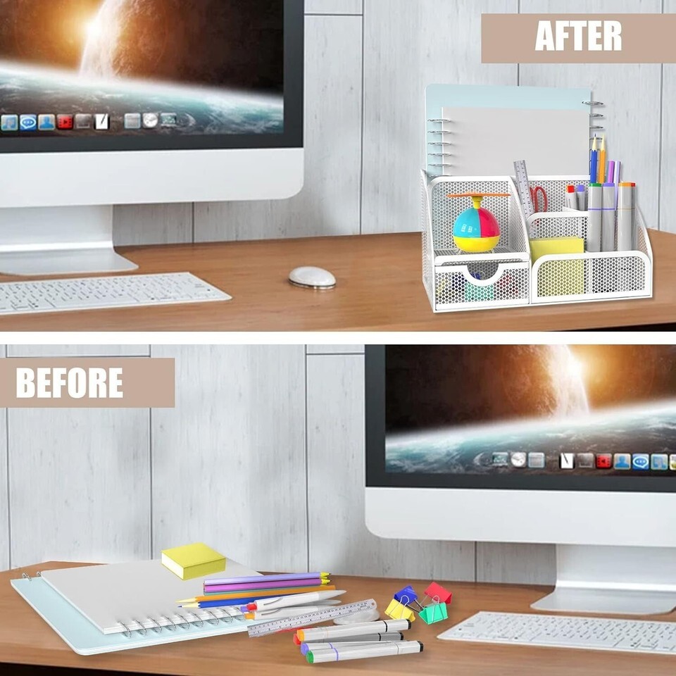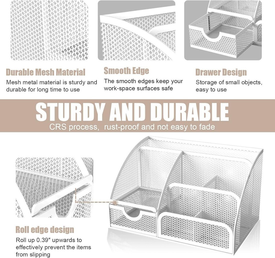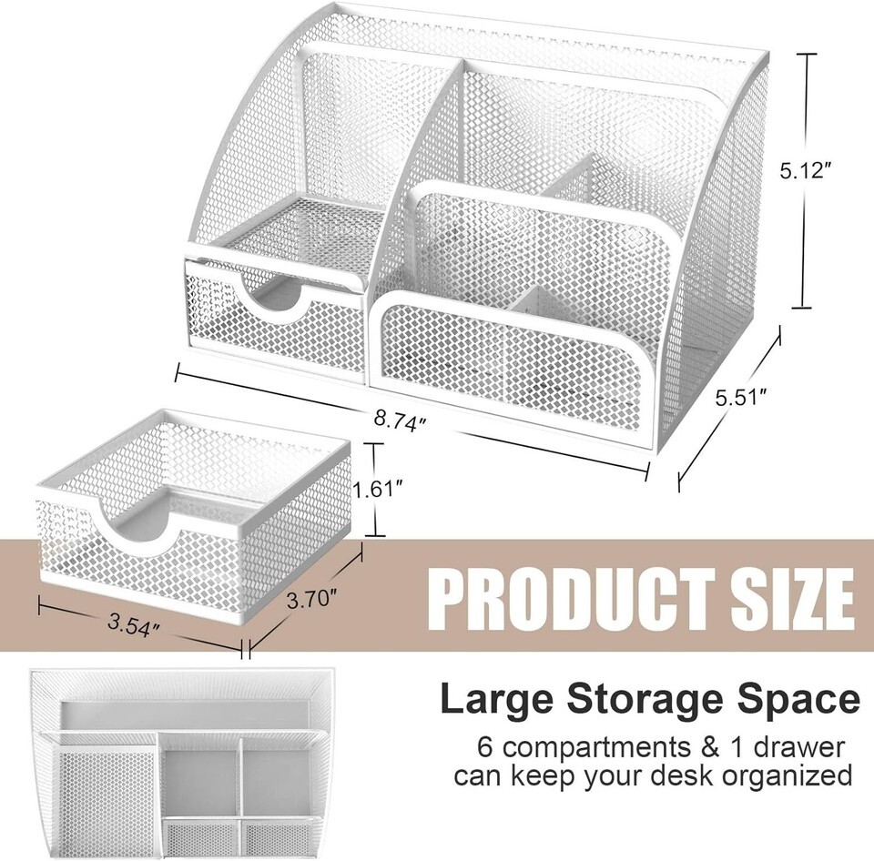 About this item ?Large Capacity Desktop Organizer?: A mesh desktop organizer with 6 compartments + 1 slide-out drawer, enough for you to organize daily necessities on the desktop and organize office supplies on the desk. Research shows that, A tidy desk can speed up work and make work easier and you are more creative ?Multifunctional Office Accessories?: As desktop decorations, home office accessories and pen holders, it can also be given as gifts to teachers, students and your loved ones. You can make the small accessories on the desktop organized. It is easier to find the accessories you need, thus saving valuable time. ?High-quality Material?: The mesh desktop storage box is made of high-quality metal and has a durable anti-rust coating. No fading, smoother and more beautiful edges, more durable and safer. The cute desk accessory has four cushions on the bottom to protect your desk ?Out of the Box?: The desktop organizer is fully assembled and can be used out of the box. The grid design makes the appearance unique and stylish. Dimensions: 8.6 x 5.7 x 5 inches / 22 x 14.2 x 12.5 cm