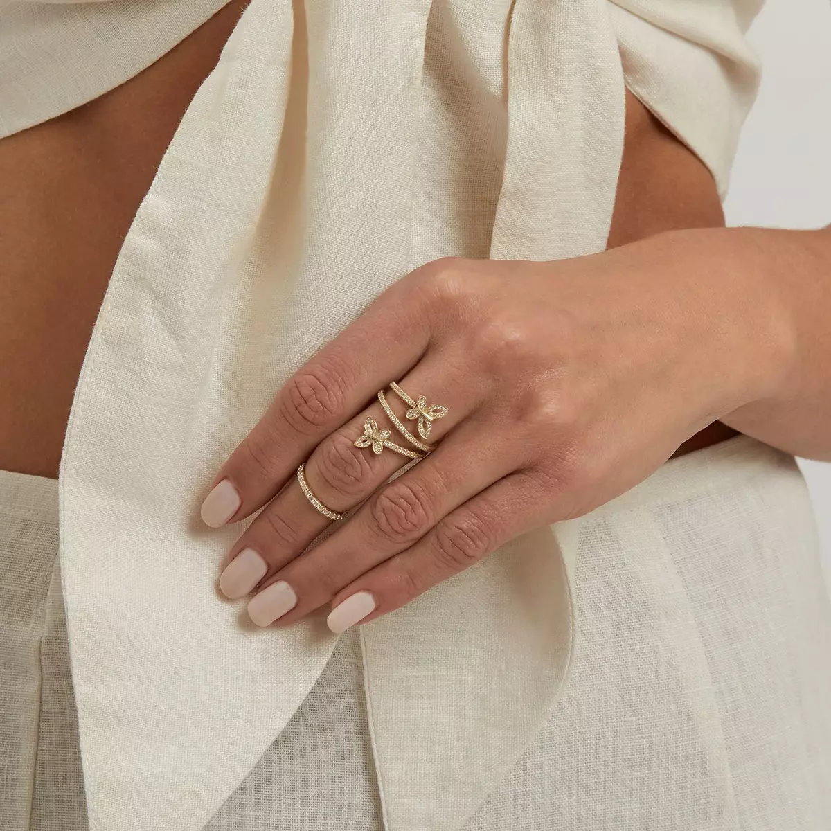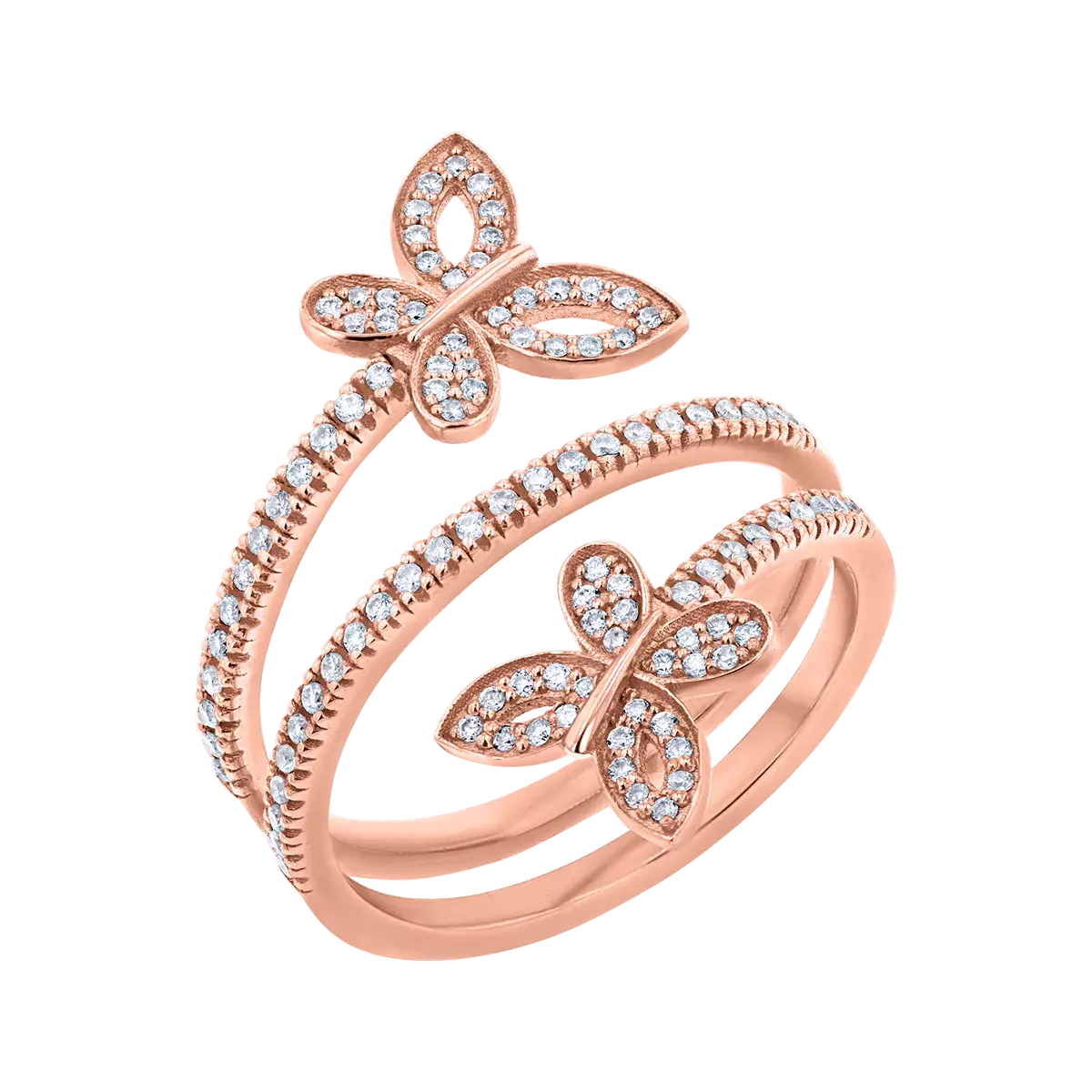 Simply stunning, this wrap around diamond encrusted double butterfly ring is one of the most magnificent pieces in our newest butterfly collection. This masterfully designed stunner will illuminate your stack and keep you inspired by the symbolic strength and beauty of the butterfly. Either worn everyday or with your favorite evening look, this piece will surely be a favorite for years to come.