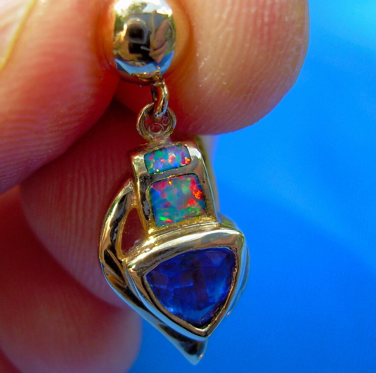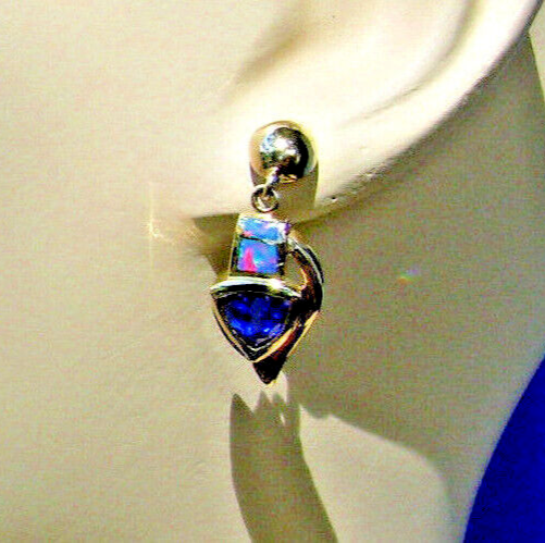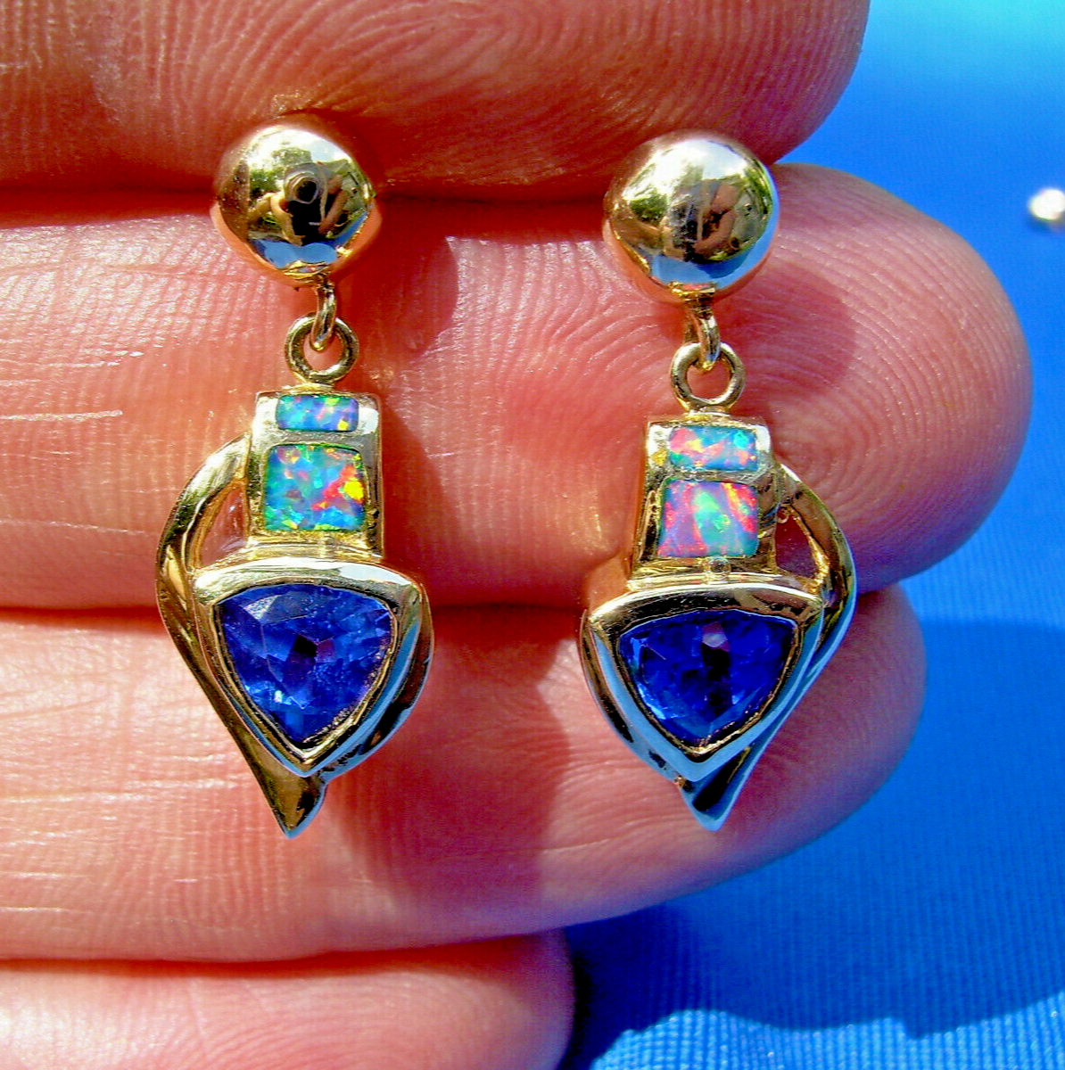 NATURAL EARTH-MINED TANZANITE AND OPAL 14K GOLD EARRINGS.