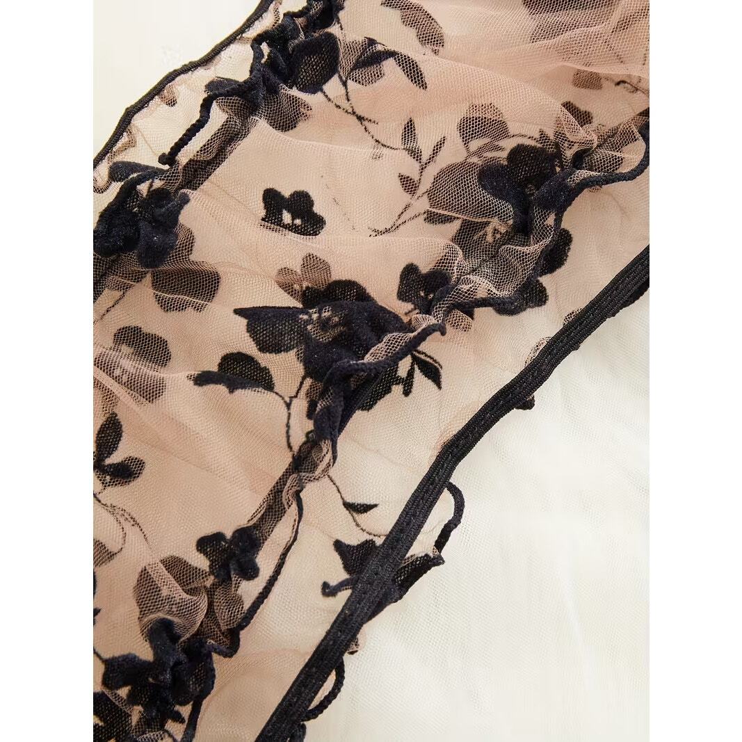 Turn up the romance with this ultra-feminine sheer floral lingerie set, designed to enchant and empower. Featuring a delicate black floral embroidery on nude mesh, this two-piece set includes a ruffled off-shoulder crop top with flutter sleeves and a coordinating thong panty with adjustable satin ribbon tie sides for a custom fit. Perfect for a boudoir look, special occasions, or simply feeling fabulous, this set blends elegance with seductive charm.