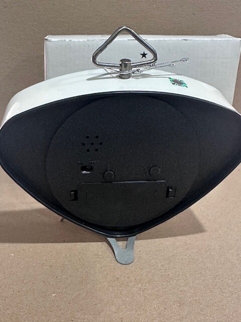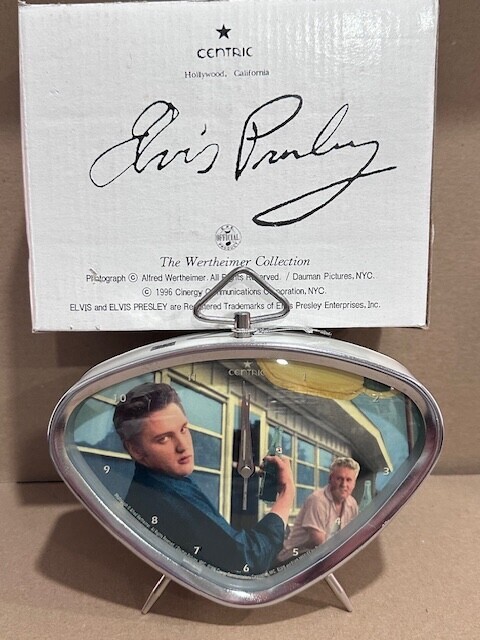Elvis Presley - Battery Operated Retro Triangle Alarm Clock Fully licensed by the Centric Co, and the EPE seal. The clock measures 5" tall and about 7" long. It requires one AA battery which will be included. We are Toy Den and have a pop culture and collectibles business since 1999. Our items are brand new, factory sealed in the original boxes/packaging, and shipped directly from boxes in our warehouse. Our items are original, authentic, and fully licensed by the manufacturer. They have not been displayed or handled.