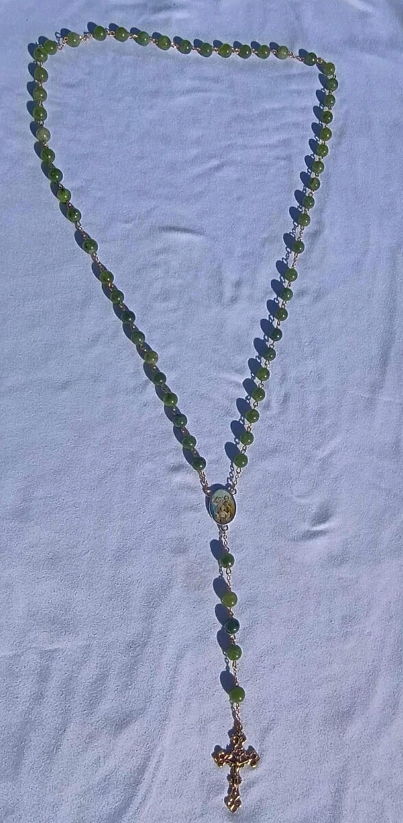 This beautiful rosary features rich green jade-style glass beads that reflect soft, natural tones ? a symbol of renewal, peace, and steadfast devotion. Each 8mm bead is hand-linked with warm gold-tone wire, creating an elegant, uplifting design perfect for prayer or gifting. The rosary is completed with a detailed gold crucifix and a vibrant Holy Family centerpiece.