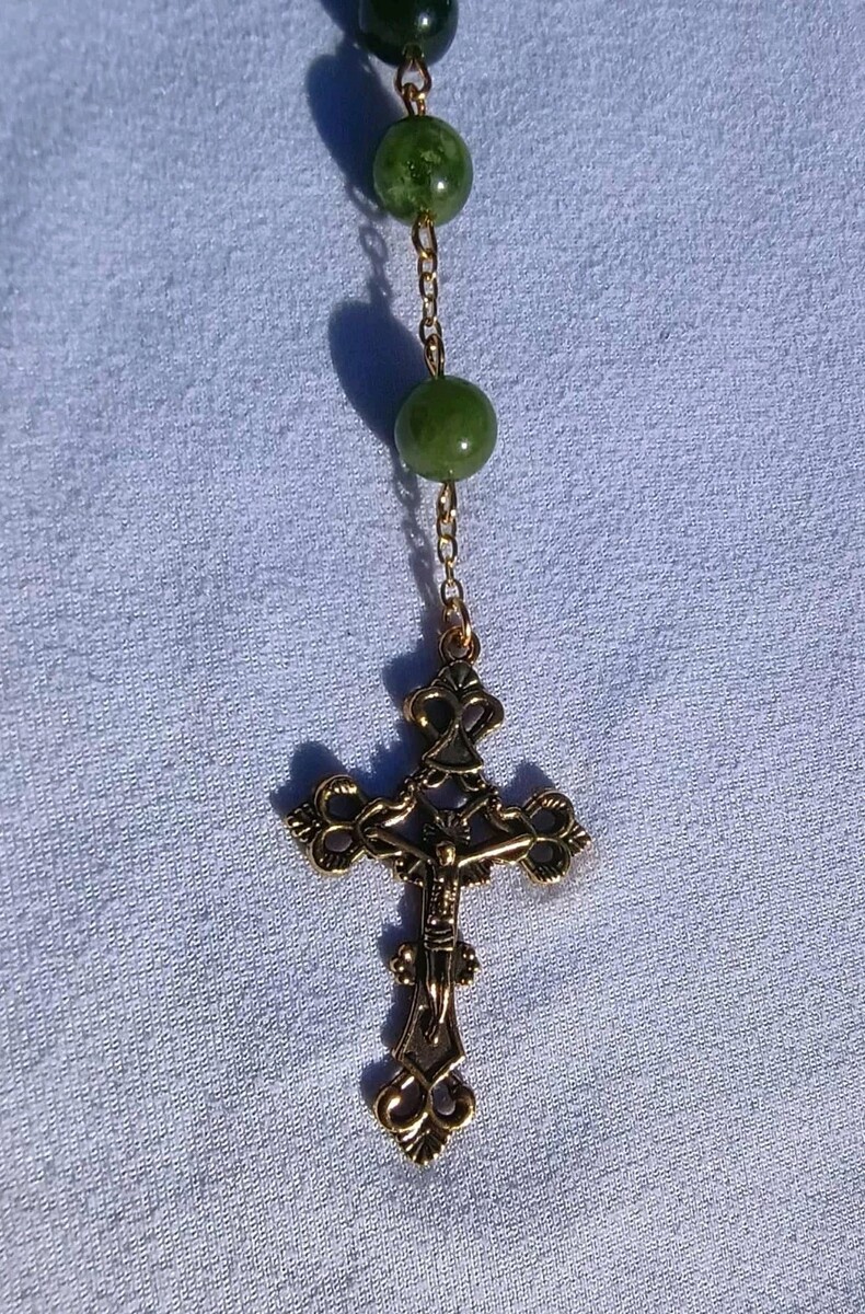 green rosary, jade rosary, Catholic prayer beads, handmade rosary, gold crucifix, Holy Family rosary, gemstone-look rosary, Christian gift, devotional beads, rosary for men or women, handmade Catholic rosary, green jade glass beads
