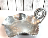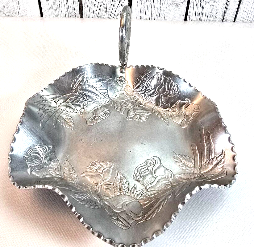 This vintage Farber Shlevin tray features hand-wrought hammered aluminum with a detailed scroll and rose motif. Ideal as a statement centerpiece, serving tray, or wall decor, it embodies timeless mid-century design. ? Hand-wrought hammered aluminum with scroll and rose embellishments ? Rolled handles and ruffled edges for both form and function ? Mid-century vintage Farber Shlevin collectible serving tray ? Excellent condition with minor age wear no dents or cracks