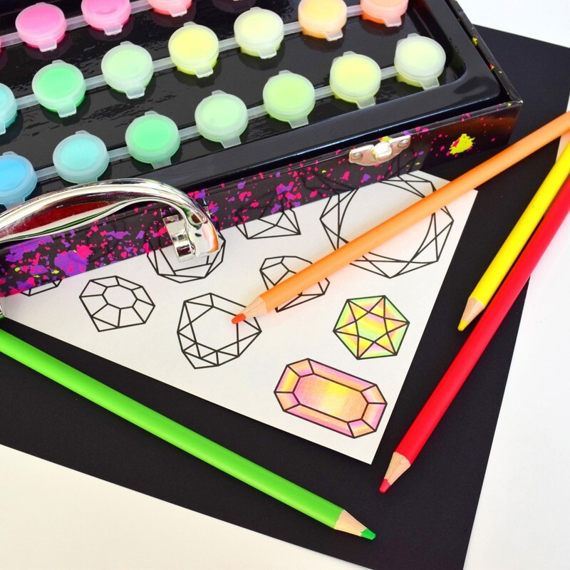 ? Multifunctional beginner set by Art 101 includes 61 versatile pieces to make a glowing creation ? Use the 4 neon colored pencils to make your creation pop, and use the 2 coloring pencils as the finishing touch ? Choose from 27 glow paint pods of bright, vibrant colors with 3 different paint brushes for precision on any project ? For Child Ages 8+