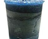 The votive candle measures approximately 2 inches tall, has been colored dark blue, and is scented with the scents of Lavender, Musk, Clove Cedar. Made in the U.S.