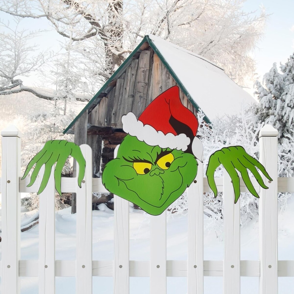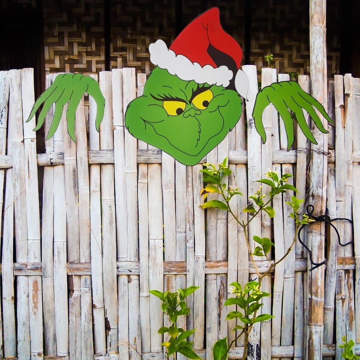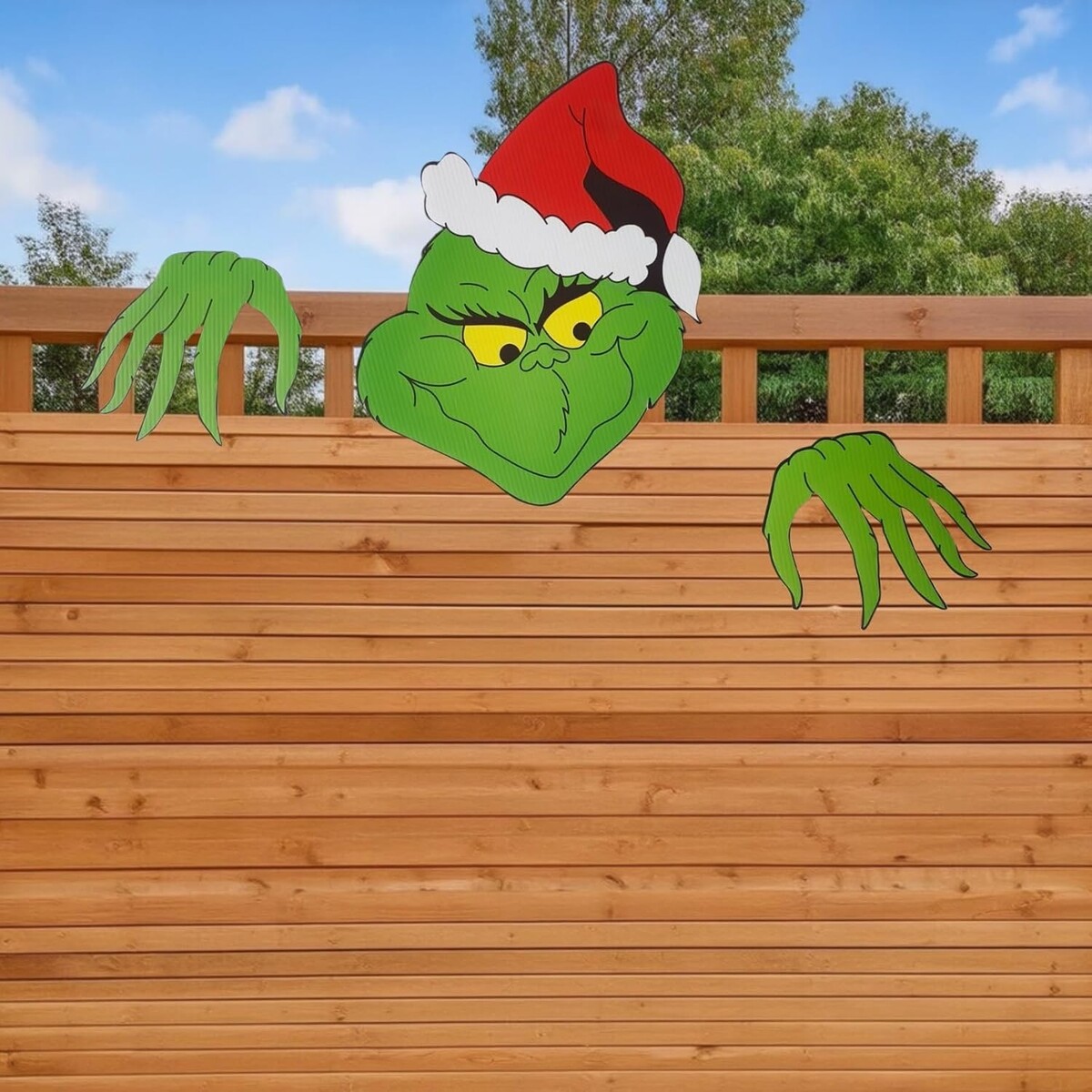 : Large Grinch face and hands create a striking visual impact that stands out in your outdoor Christmas display. Perfect for mounting on fences, walls, courtyards, or along your roofline, this whimsical decoration adds a fun twist to traditional Christmas displays. Bring mischievous holiday cheer to your outdoor decor with this playful Grinch fence peeper decoration.