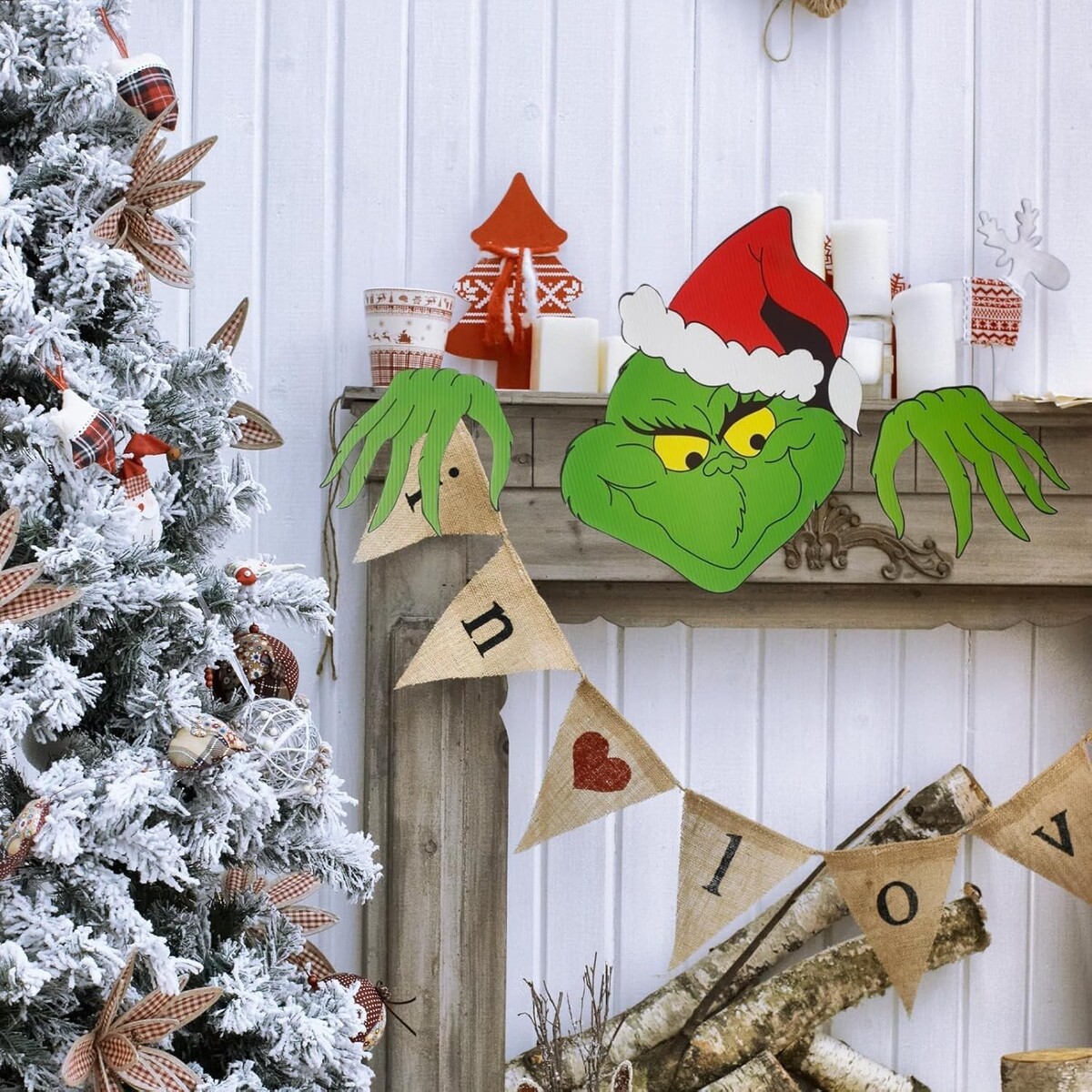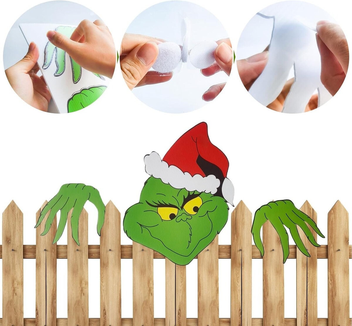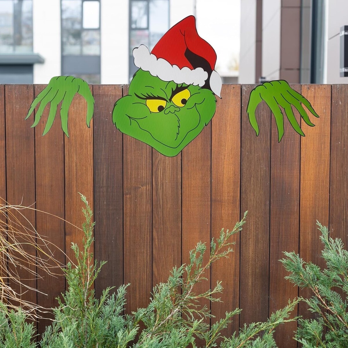: Large Grinch face and hands create a striking visual impact that stands out in your outdoor Christmas display. Perfect for mounting on fences, walls, courtyards, or along your roofline, this whimsical decoration adds a fun twist to traditional Christmas displays. Bring mischievous holiday cheer to your outdoor decor with this playful Grinch fence peeper decoration.