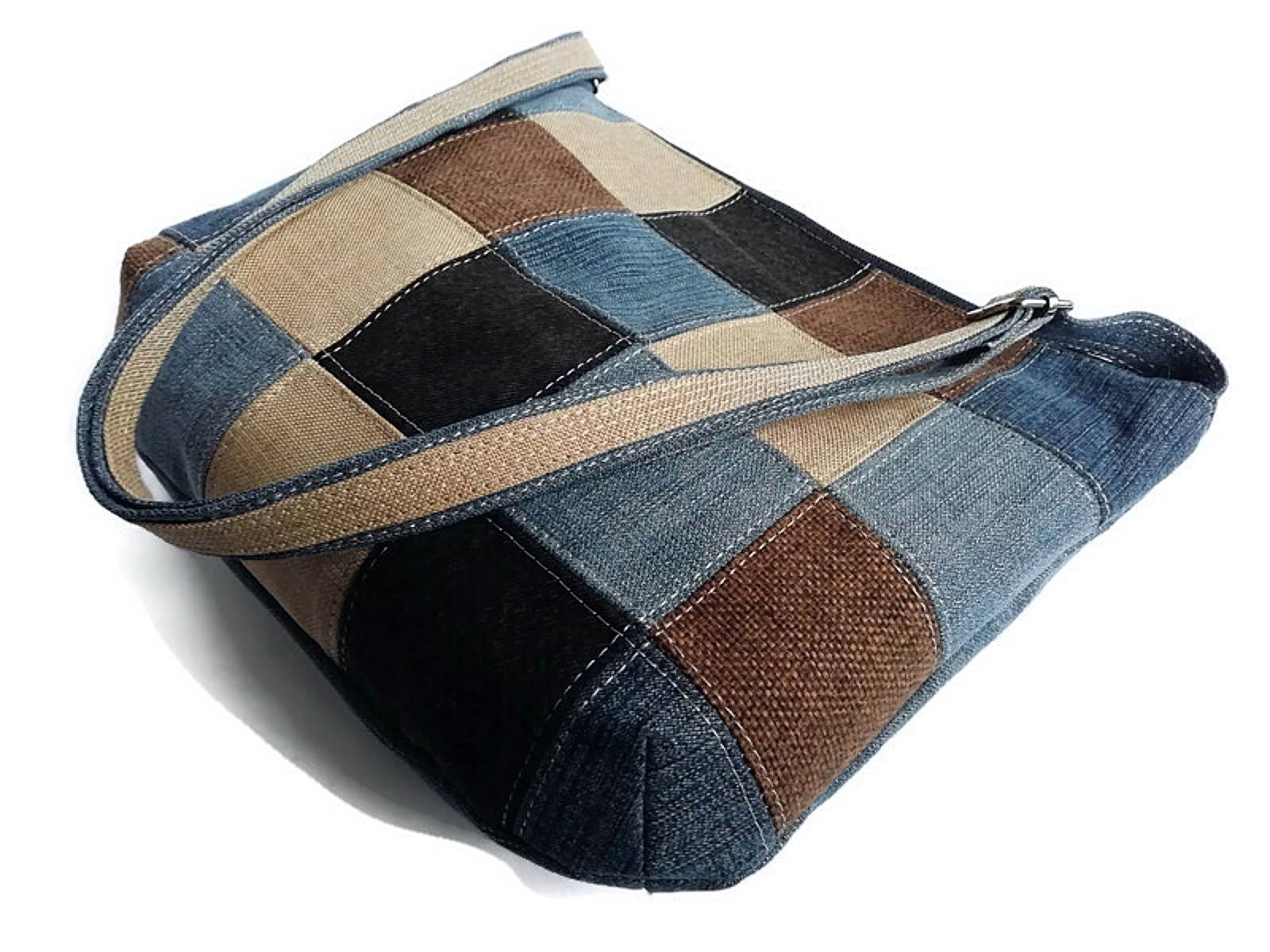 Handmade Patchwork Denim Crossbody Bag: Upcycled Canvas Tote