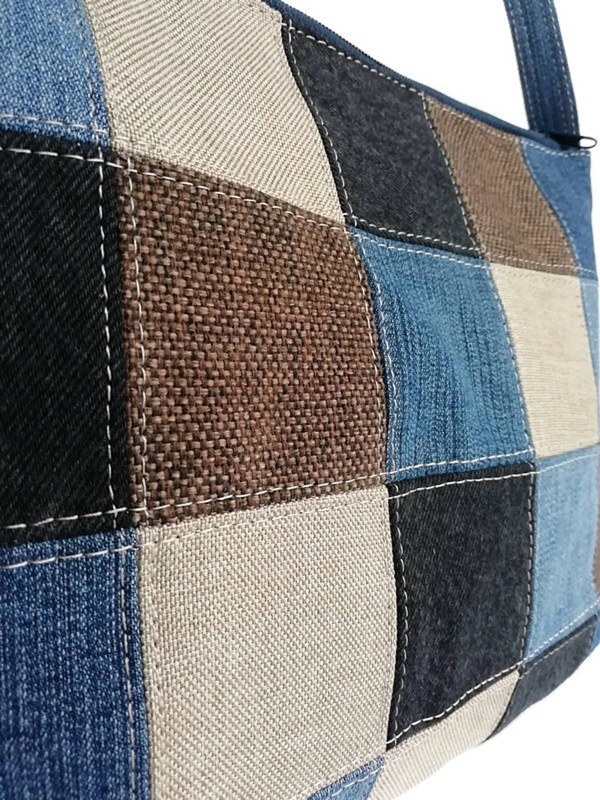 Bring texture and timeless style to your everyday look with this handmade patchwork bag, crafted from squares of recycled denim and canvas in soft beige and brown tones. Designed for daily wear, this bag effortlessly blends earthy colors with practicality and sustainability.