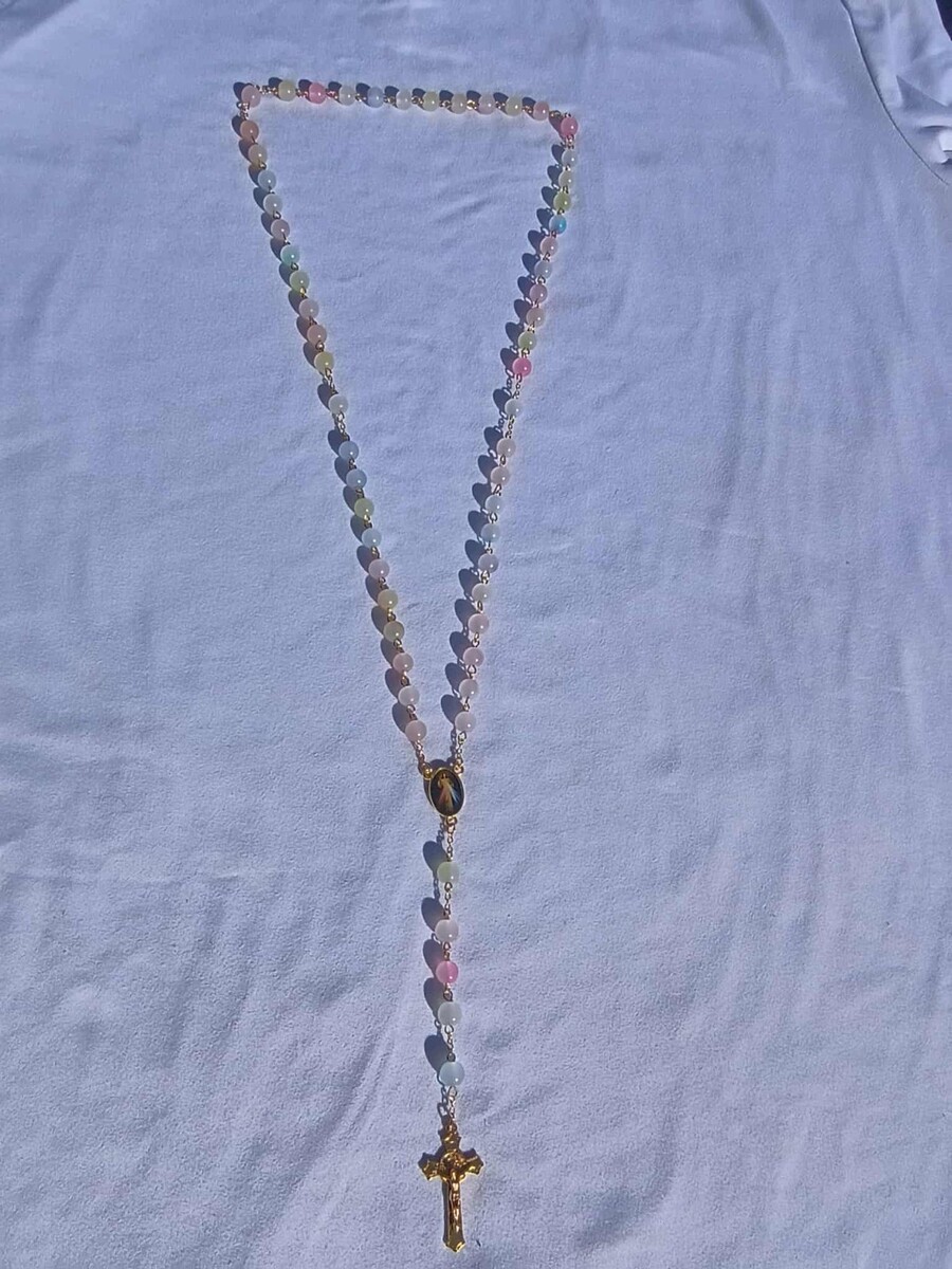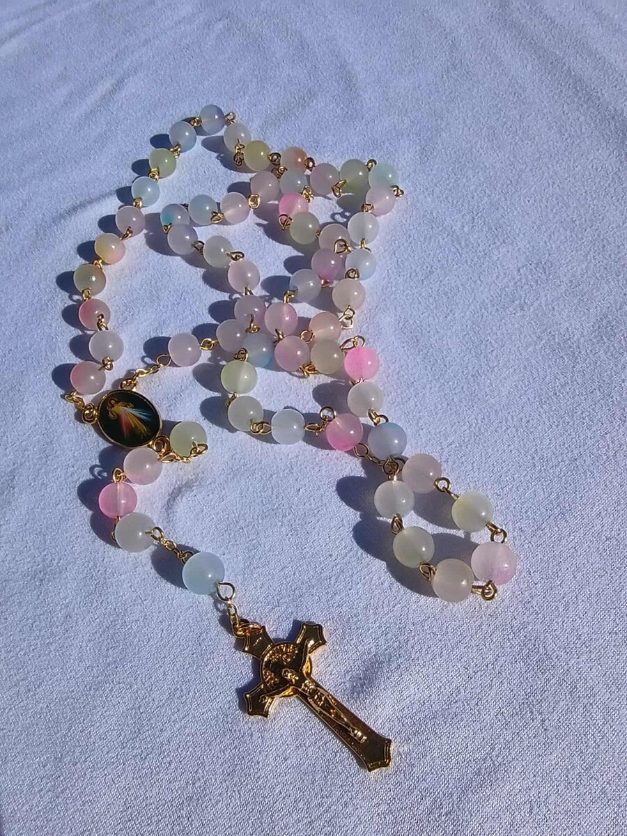 This enchanting rosary features 8mm Heavenly Pastel Glow glass beads, each one softly frosted and kissed with gentle shades of pink, blue, mint, lavender, cream, and blush. The delicate pastel colors shimmer gracefully against the gold-tone chain, creating a look that is peaceful, uplifting, and almost ethereal.