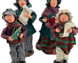 A family of 4 fabric Mache Christmas carolers in Victorian garb. Main colors are red and green.