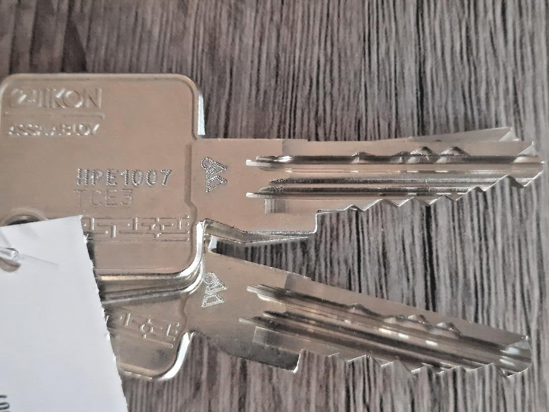 The patented IKON radii profiles are based on a high quality and sturdy nickel silver key blank with 10 active spring-mounted pin tumblers. There is an additional coding cut into the long sides of the key, the blocking wave. This coding is read by special spring-loaded tumblers in the locking cylinder. If a key with missing or incorrect coding is used, the locking action will be blocked. The additional undercut in the key profile makes the key shape extremely complex and consequently enhances copying protection. The additional undercut in the key profile makes the key shape extremely complex and consequently enhances copying protection. The blocking wave profile meets the requirements for mechanical protection against key copying and against lock picking to a very large extent. Additional
