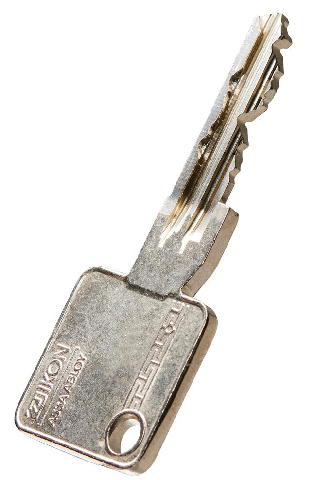The patented IKON radii profiles are based on a high quality and sturdy nickel silver key blank with 10 active spring-mounted pin tumblers. There is an additional coding cut into the long sides of the key, the blocking wave. This coding is read by special spring-loaded tumblers in the locking cylinder. If a key with missing or incorrect coding is used, the locking action will be blocked. The additional undercut in the key profile makes the key shape extremely complex and consequently enhances copying protection. The additional undercut in the key profile makes the key shape extremely complex and consequently enhances copying protection. The blocking wave profile meets the requirements for mechanical protection against key copying and against lock picking to a very large extent.