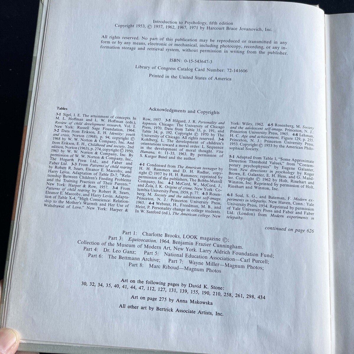 This is the classic Fifth Edition of 'Introduction to Psychology' by Hilgard and Atkinson, a foundational text for undergraduate students. Famous for its comprehensive coverage and clarity, this edition offers a fascinating historical perspective on the field as it was taught in the 1970s. This hardcover copy is in good condition for its age, showing some expected shelf wear, corner bumping, and light soiling on the cloth cover. It's an excellent resource for psychology students, educators, and collectors of vintage academic books.