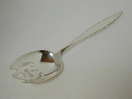 Sterling silver new in factory sleeve Serving Spoon 8 3/8" in the pattern Lace Point By Lunt. It is not monogrammed and is in excellent condition.