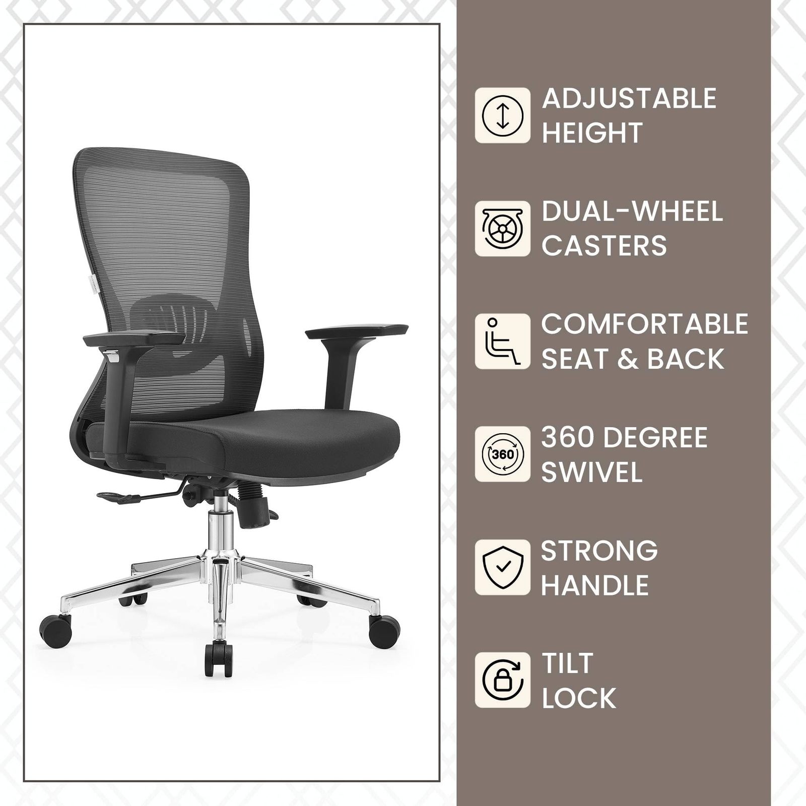 Immerse yourself in satisfaction with the Adorit Office Chair, featuring a meticulously crafted back. The curved design not only enhances posture but also fosters a comfortable workspace by improving air circulation and providing exceptional lumbar support. Crafted with a robust ABS plastic frame, this task chair is designed to support up to 265 lbs without compromising stability or longevity. This attention to detail extends to the base and wheels ensuring that your chair remains reliable and resilient, even in the busiest of office environments. The soft cotton seat is designed for extended use without sacrificing coziness. The superb cotton material not only provides optimal relief but also offers breathability, keeping you cool and comfortable. The adjustable height and armrests offer personalized support that reduces discomfort in your body by allowing you to find your ideal seating position. Achieve optimal posture and relaxation with ease. Effortlessly navigate your workspace with our office chairโs 360-degree swivel function, designed to promote seamless movement and accessibility. Say goodbye to constant adjustments and hello to enhanced productivity in a dynamic work environment. Our modern office chair's synchro-tilt mechanism allows synchronized seat and backrest tilting for superior ergonomic support. Experience reduced back and leg pressure, ensuring a more enjoyable and productive work experience, even during long hours. Assembling our office chair is quick and easy. Clear instructions are provided, allowing you to have your computer desk chair ready for use in just a few minutes, minimizing setup time and enhancing your workspace efficiency.