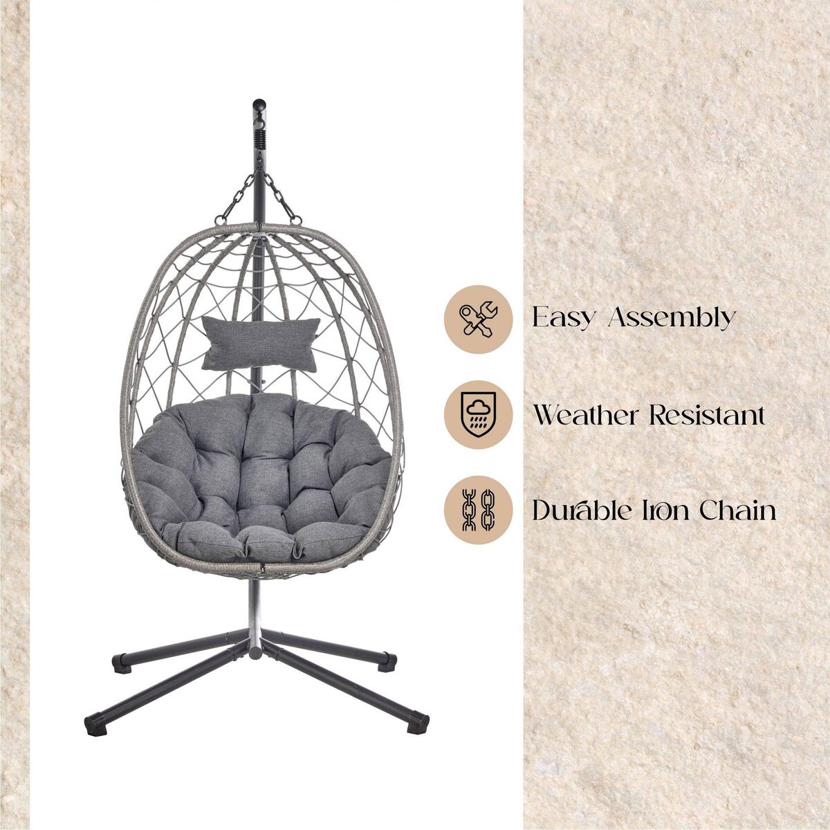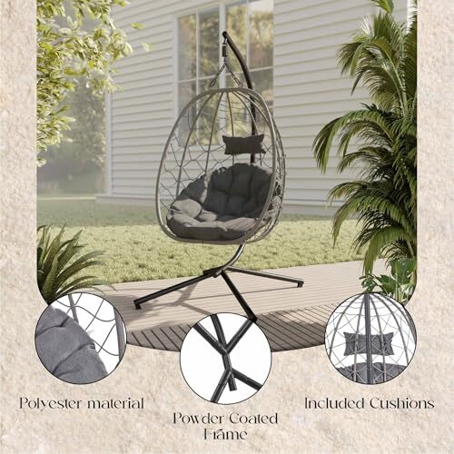The Egg Swing Chair is crafted with a thoughtful design, i'ts singular capacity ensures a cocoon-like ambiance, perfect for moments of solitude or quiet reflection. A robust steel frame forms the backbone of the Egg Swing Chair. The steel construction is chosen for its durability, making it a reliable choice for outdoor furniture exposed to various weather conditions. The steel frame is adorned with a powder-coated finish, adding a touch of sophistication and providing a protective layer. The egg swing chair comes with polyester cushions, ensuring an immediate and comfortable seating experience. The cushion covers are removable, machine washable, and practically offer easy maintenance. Crafted with weather-resistant materials, the Egg Swing Chair stands resilient against the elements. Rain or shine, this chair retains its quality. The swing chair is suspended by a durable iron chain not only contributes to the chair's stability but also evokes a timeless aesthetic that complements various outdoor settings. Clear instructions and all necessary hardware are included, making the assembly process accessible and straightforward.