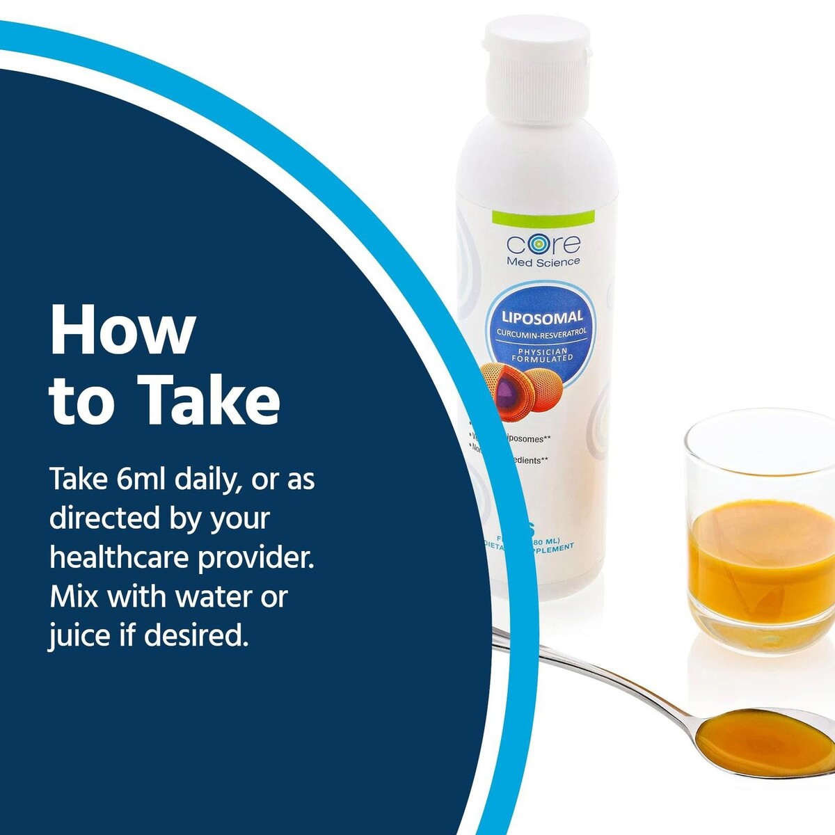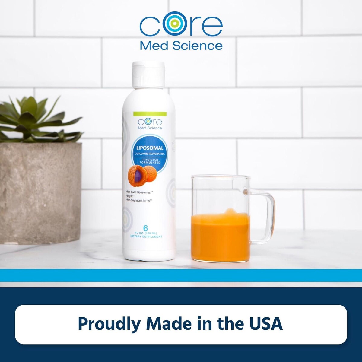 Boost your health with Core Med Science Liposomal Curcumin with Resveratrol! This physician-formulated liquid supplement is designed to support focus and clarity, heart and joint health, cellular health, and mood. Made with non-GMO liposomes and free from soy, alcohol, tree nuts, dairy, peanut, and egg, it's perfect for a clean, allergen-friendly lifestyle. Enjoy max absorption technology in every 6-milliliter serving, packed with 200 mg of curcuminoids and 75 mg of resveratrol. Made in the USA with natural flavors for a refreshing and effective daily boost!