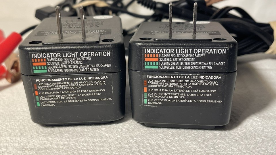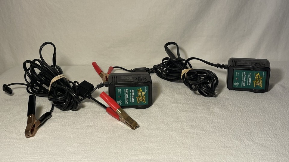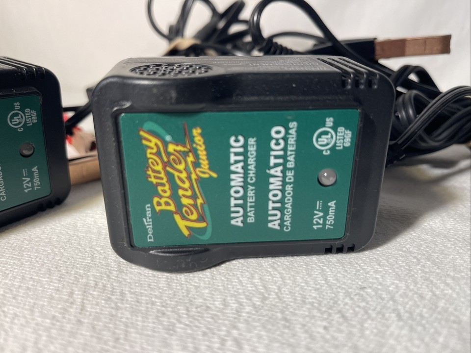 The lot includes two Deltran Battery Tender Jr 12V chargers with a high efficiency output of 750mA. The manufacturer part number is 021-0123. These chargers are designed for 12V batteries and are ideal for maintaining the charge of automotive batteries.
