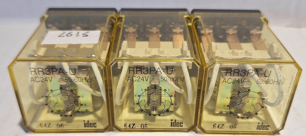 The product is a lot of 3 IDEC RR3PA-UAC24V power relays, specifically designed for electrical equipment and industrial use. These 3PDT 10A 24VAC relays feature 11 pins in an octal arrangement, making them ideal for a variety of automation and control applications. With the reputable brand of IDEC, these power relays are reliable and efficient for managing power distribution in various industrial settings.