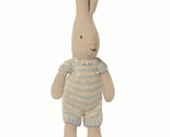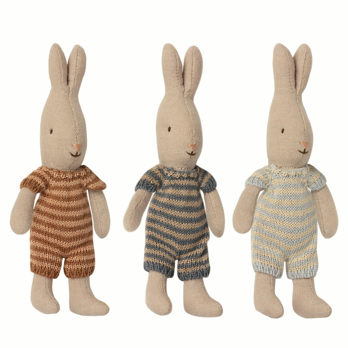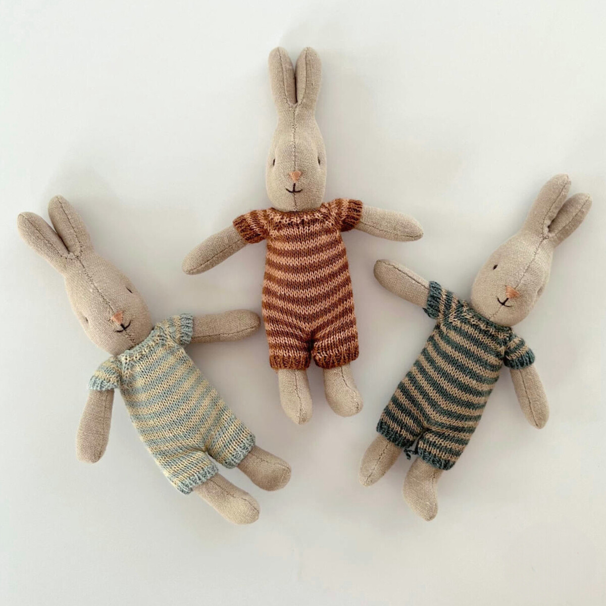 This soft miniature rabbit comes dressed in a beautifully knitted striped romper made from a gentle linen/cotton blend. Its compact 6-inch size makes it perfect for dollhouses, miniature furniture, or small imaginative play setups.