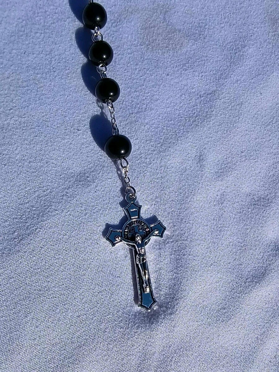 This elegant rosary features smooth 8mm black glass beads linked by silver-tone hardware for a clean, traditional look. The centerpiece displays the Holy Family, symbolizing unity, protection, and unwavering faith. A silver-tone crucifix completes this reverent devotional piece, perfect for daily prayer or meaningful gifting.