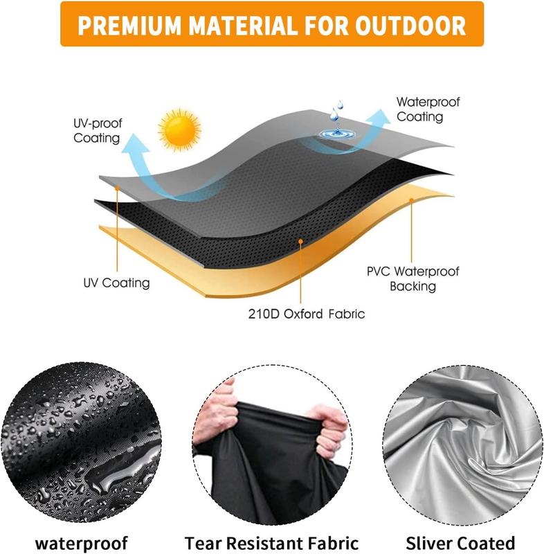 1. Adopts the advanced coating silver 210D Oxford material, This material?s feature is durable, light weight, strong toughness, UV-Resistant, sunshine block, dustproof and it has a long service life.