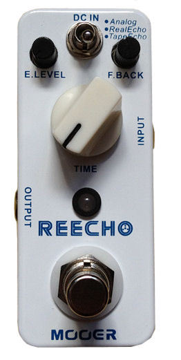 The Reecho is an ultra-compact, digital delay pedal featuring delay times of up to 780ms as well as three delay modes (Analog, Real Echo, and Tape Echo).