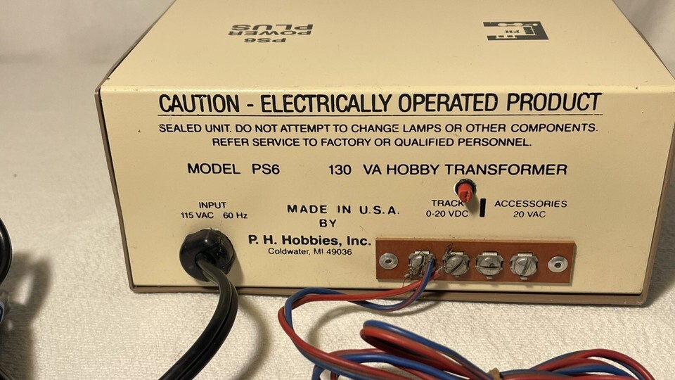 This P.H. Hobbies "G" Smaller DC Power Supply PS6 Power Plus/ 5015/1 Feed Clips/Wires is a great addition to your model railroad power and control setup. The transformer is designed for DC power type and is compatible with UP THROUGH G gauge. It is a high-quality product from a trusted brand, perfect for model train enthusiasts. The model number is P.H. PS6 POWER PLUS and it comes with feed clips/wires attached. This transformer is ideal for those who want a reliable and efficient power supply for their model trains. It belongs to the Toys Hobbies category and is specifically designed for Model Railroads Trains, Power Control, and Transformers.