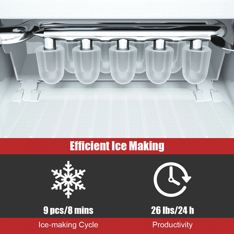 Efficient Ice Maker:Featuring with fast and efficient function, this portable ice maker machine only spends 8 minutes making 9 pcs delicious and chewable bullet-shaped ice, saving your time to make yummy food and drinks. And it can produce 26 lbs of ice each day to provide enough ice for you. SimpleControl Panel:Equipped with easy control panel and transparent lid, this compact ice maker not only offers self-cleaning function which offers great convenience for you, but also allows you to check the progress. Quiet Operation: Coming with 45 dB low noise operation, this electric ice making machine will not disturb your daily work and activity while achieving low consumption. And the evaporators are made of pure copper with plating which are highly efficient and sturdy. Portable Compact Design: Measuring with 12'' x 9'' x 12'' (L x W x H) in dimension, this countertop ice maker machine with 70'' power cord is suitable for home, office, party and bar, enjoying delicious food in anywhere. And the portable and compact design allows you to carry and store with ease. Sweet Accessories: This premium ice maker includes an ice scoop and a removable basket, allowing you to take out the ice easily. And the ETL certification ensures your safety. Also, non-slip foot pads provide strong stability.