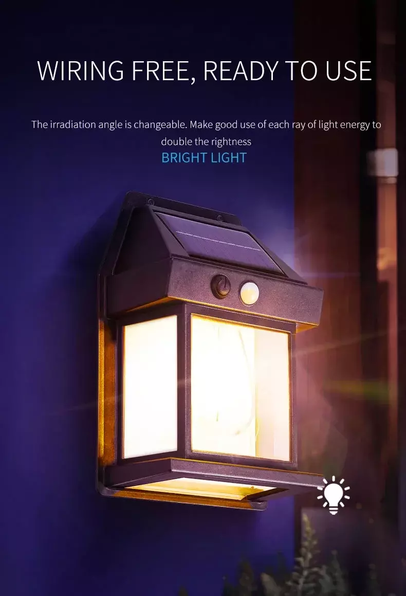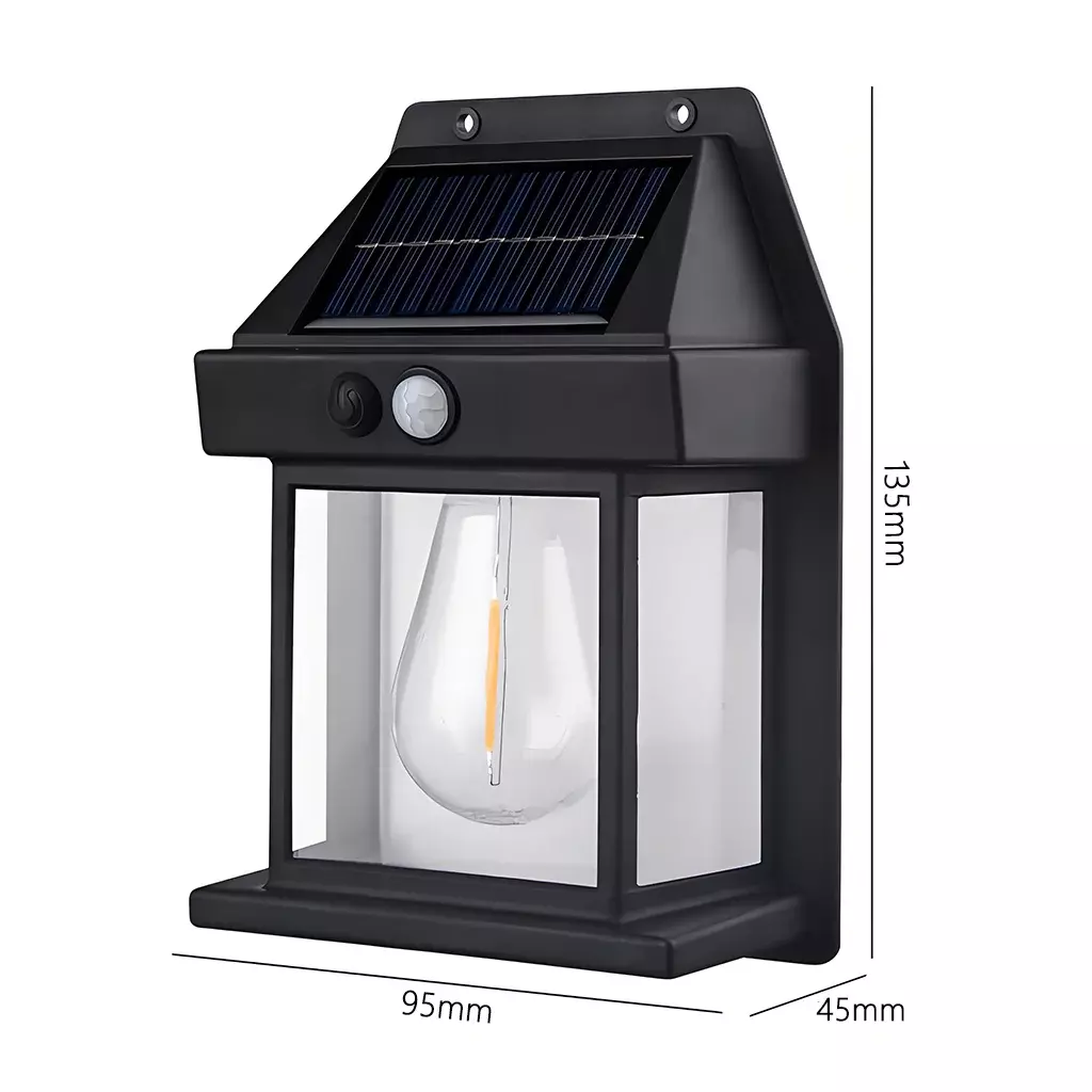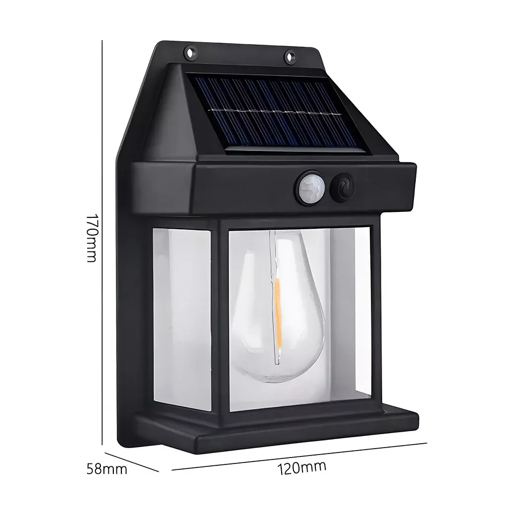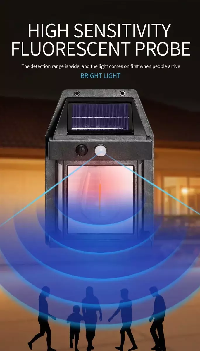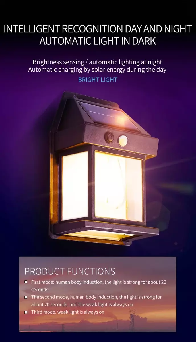 ? Features 1.Advanced Solar Charging Equipped with high-efficiency solar panels that absorb sunlight during the day and automatically light up at night. 2.Smart Light Sensor (IC Sensor) Detects ambient brightness and automatically turns on at dusk and off at dawn. 3.PIR Motion Sensor * Detects motion within 19FT (approx. 6 meters) * 120 wide detection angle * Lights up when motion is detected at night * Automatically turns off after 15 seconds of no movement 4.Wide Application Ideal for patios, gardens, yards, barns, garages, walls, fences, and more. ? Specifications Color Options: White / Black Material: PC + ABS Lighting Time: 6?12 hours (continuous) Protection Rating: IP65 (weatherproof) Output Power: 3.2V / 3W Switch Type: Manual Solar Panel: Monocrystalline silicon 5.5V 1.43W ? Button Light Modes ON: Press to cycle through 3 modes. Mode 1: Lights up for 15?30 seconds when motion is detected, then turns off. Mode 2: Bright light for 15?30 seconds when motion is detected, then stays dimly lit. Mode 3: Always-on low light, regardless of motion. ? Package Includes 1 Solar Tungsten Wall Light 1 Instruction Manual 1 Screw Accessories Kit ?? Important Notes 1.Manual measurement may cause slight size differences. 2.Before use, remove the protective film on the solar panel. 3.Clean the surface regularly to ensure optimal charging efficiency. 4.For first use, charge the light in direct sunlight for at least 5 hours. 5.Avoid installing near other light sources to prevent interference with light sensor. 6.Ensure the solar panel is installed facing south at a 30 tilt for best charging results. 7.Prevent hard or sharp objects from striking the solar panel to avoid damage.